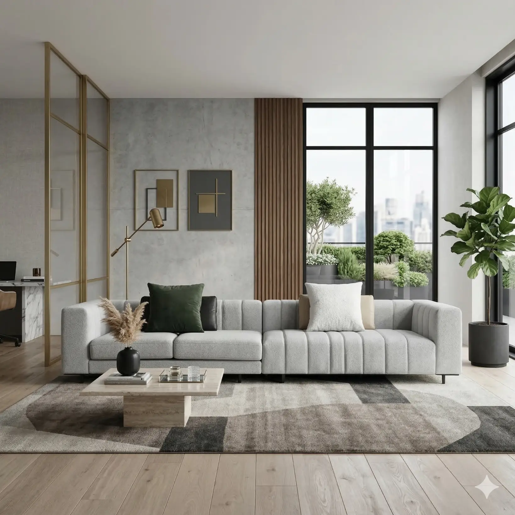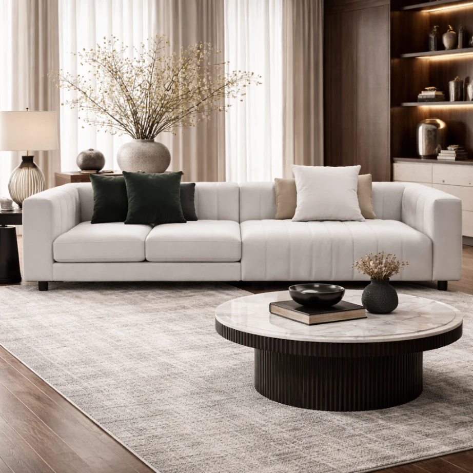 Vertical channel stitching introduces a subtle cadence across the upholstery, giving the surface depth and architectural order. The overall impression is quiet and precise: a sofa designed to sit naturally within contemporary interiors, offering comfort through volume and restraint through line. Loose cushions allow for a more relaxed posture while maintaining the same edited, tailored presence.