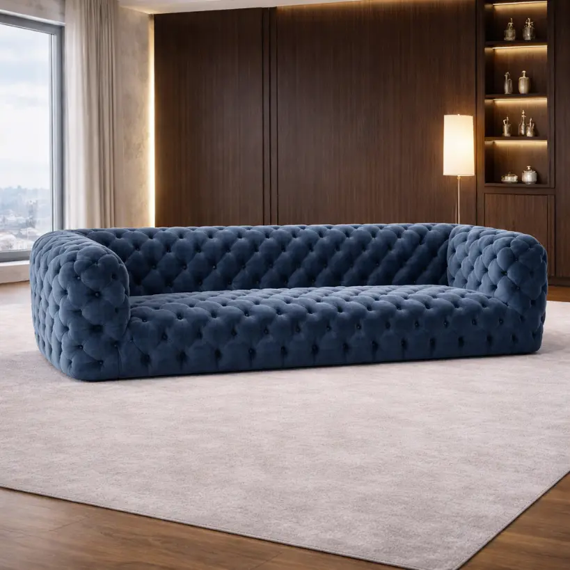 The base is finished in stained solid wood, available in walnut, oak, or darker contemporary tones. Customization options include alternative upholstery selections, cushion configurations, and wood finishes, allowing the piece to adapt while maintaining its architectural clarity and balanced proportions.