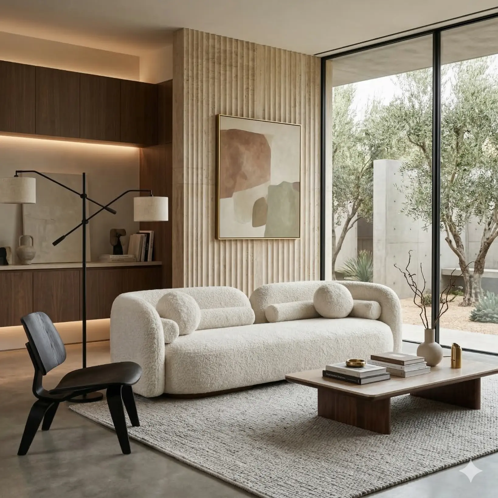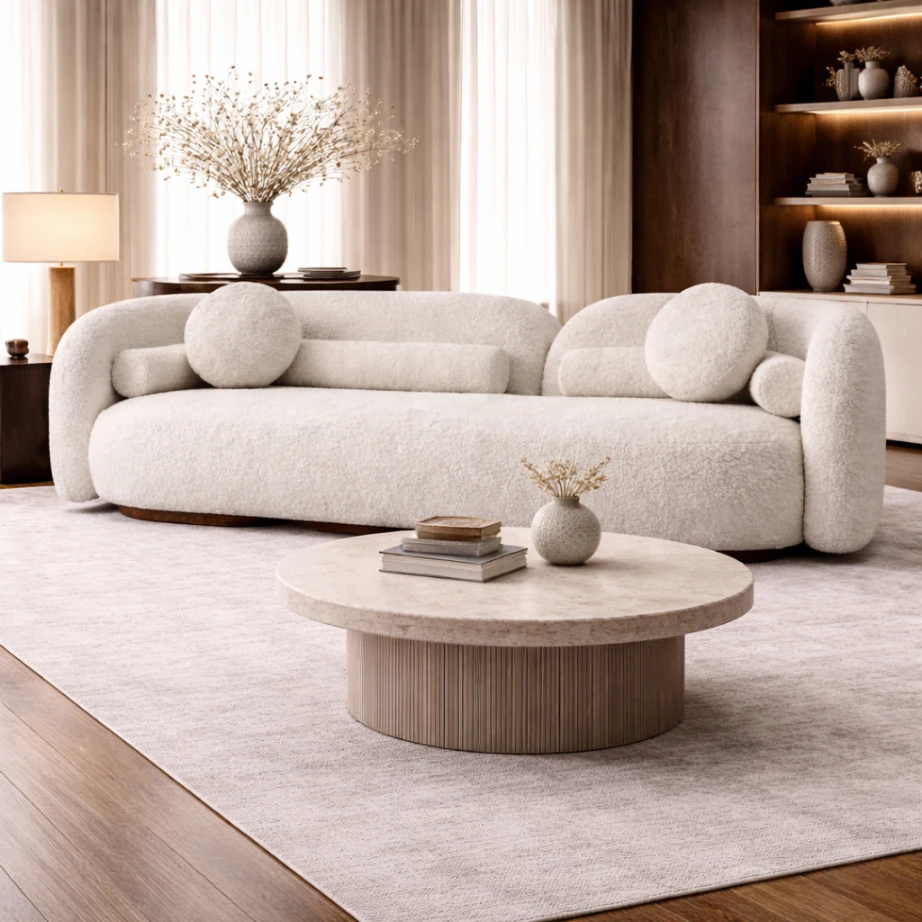 The tactile boucle upholstery softens the architectural clarity of the form, creating a nuanced dialogue between structure and comfort. Cylindrical lumbar cushions and circular accent pillows introduce rhythm without disturbing the visual balance. The sofa reads as a sculptural element within the room—present, yet understated.