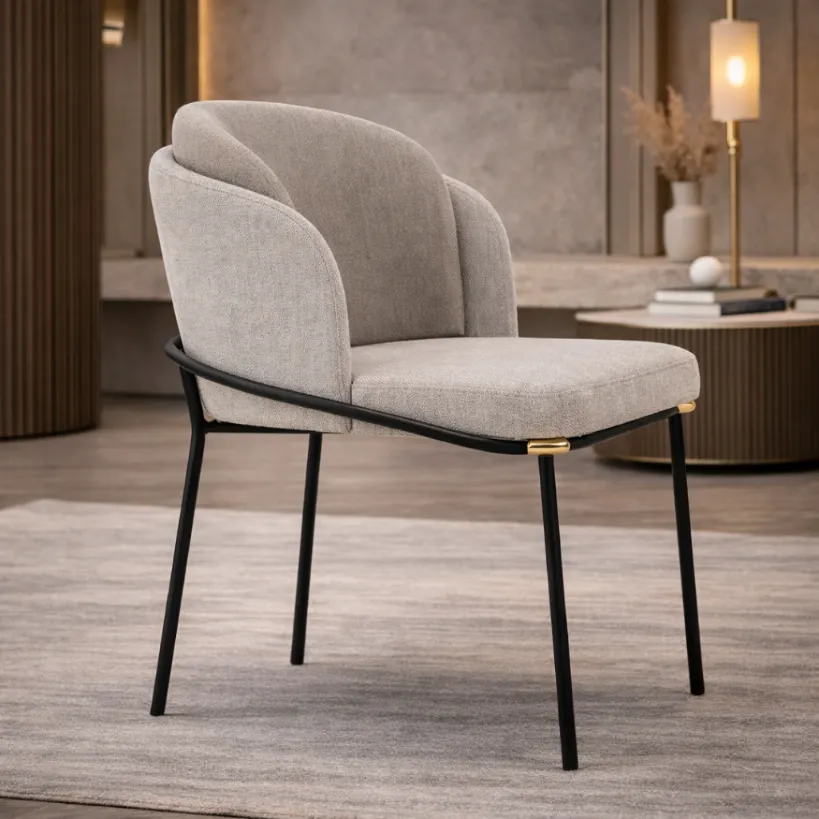 Crafted with a solid internal seat structure and shaped cushioning to maintain the chair’s tailored lines and supportive back. Shown in a light, tightly woven upholstery—suggestive of a linen-blend or fine wool—selected for its matte surface and subtle texture. The frame appears in powder-coated steel with a dark finish, formed into slender legs and a curved support rail that cradles the upholstered body. Accent elements read as brushed brass or satin gold-toned metal, used sparingly to highlight connection points and reinforce the chair’s balanced detailing.