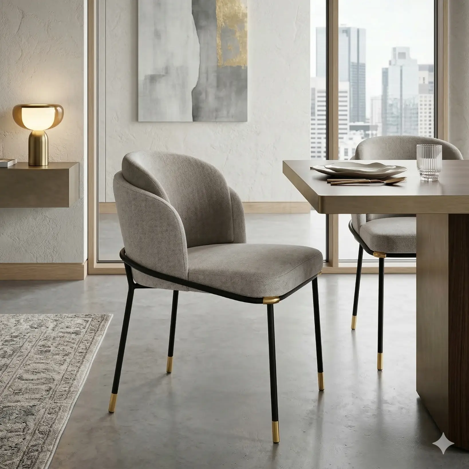 This Alba Dining Chair is defined by restraint and precision. The upholstered body reads as a calm shell—rounded at the back, slightly pinched at the sides—designed to hold the sitter with gentle enclosure while maintaining a clean silhouette. The seat is generous but controlled, with a smooth plane that extends forward for comfort. Beneath, a slim metal structure draws an elegant perimeter line around the upholstery, creating a quiet contrast between soft volume and architectural frame. Small warm-metal accents appear at key junctions, adding depth and material clarity in a deliberately understated way.