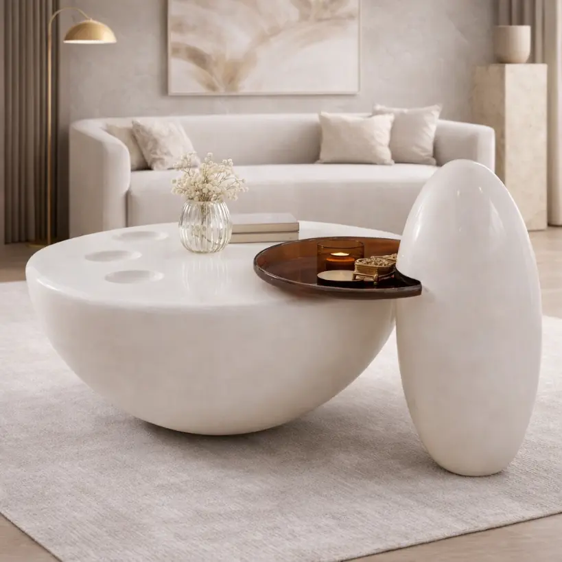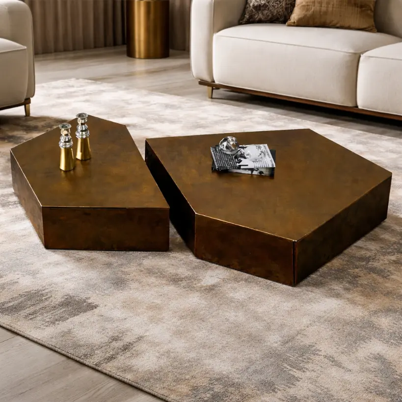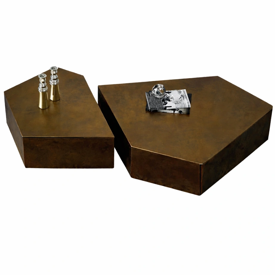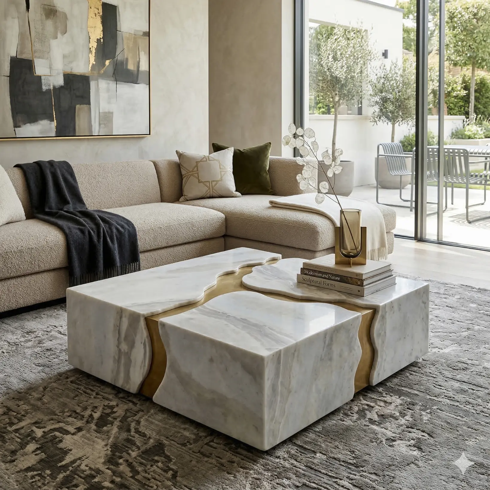 This Alcantara Coffee Table reads as a piece of carved architecture. A low stone monolith is interrupted by a sinuous channel—precise in its path, softened at the edges—revealing a warm metallic core that runs through the volume like an inlaid seam. The stepped geometry creates a quiet hierarchy of planes, allowing the table to feel substantial without visual heaviness. What makes the piece compelling is the balance between crisp mass and fluid incision: straight edges held in tension with a single organic line. In a room, it anchors the seating area with restrained presence and a clear sense of materiality.
