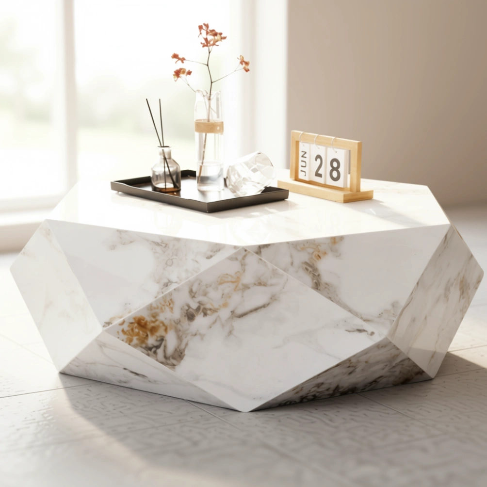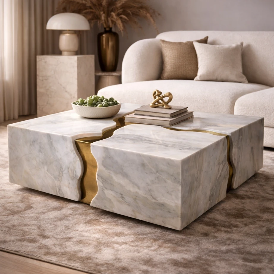 Crafted from solid marble—shown in a pale stone with fine grey veining—precision-cut and honed for a soft matte touch that reduces glare and highlights the table’s mass. The carved channel is inlaid with a warm metal, suggestive of brushed brass, finished to sit flush and read as a continuous seam through the stone. Edges are cleanly resolved with slight softening where the cut line transitions, preserving architectural clarity while refining the hand feel.