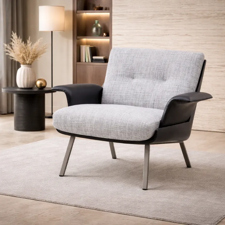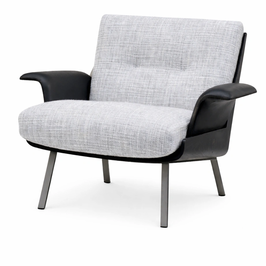Available in a curated range of fabrics and leathers, with customization across upholstery tone, texture, and seam definition. Wood elements can be specified in alternative stains and finishes to adjust warmth and contrast, allowing the chair to read either tonal and quiet or more materially articulated, while maintaining its balanced proportions.