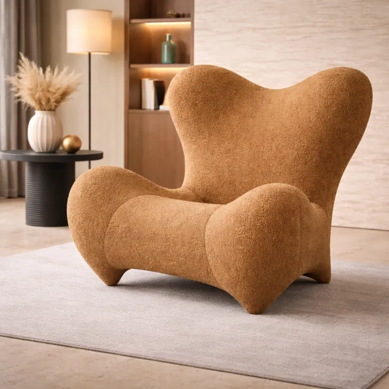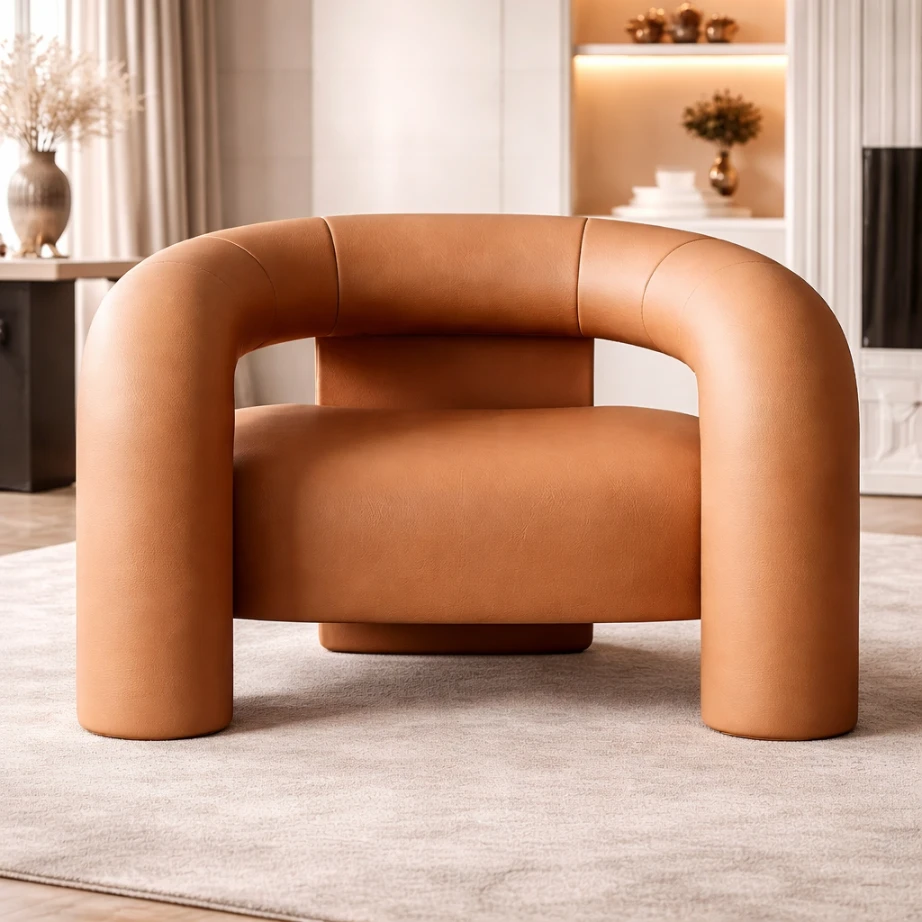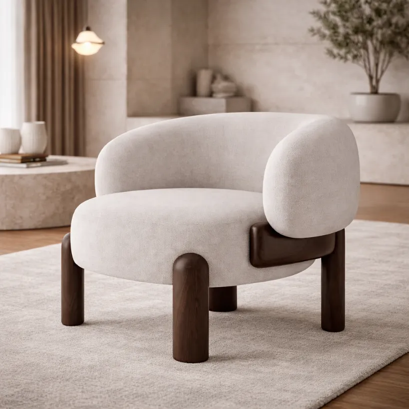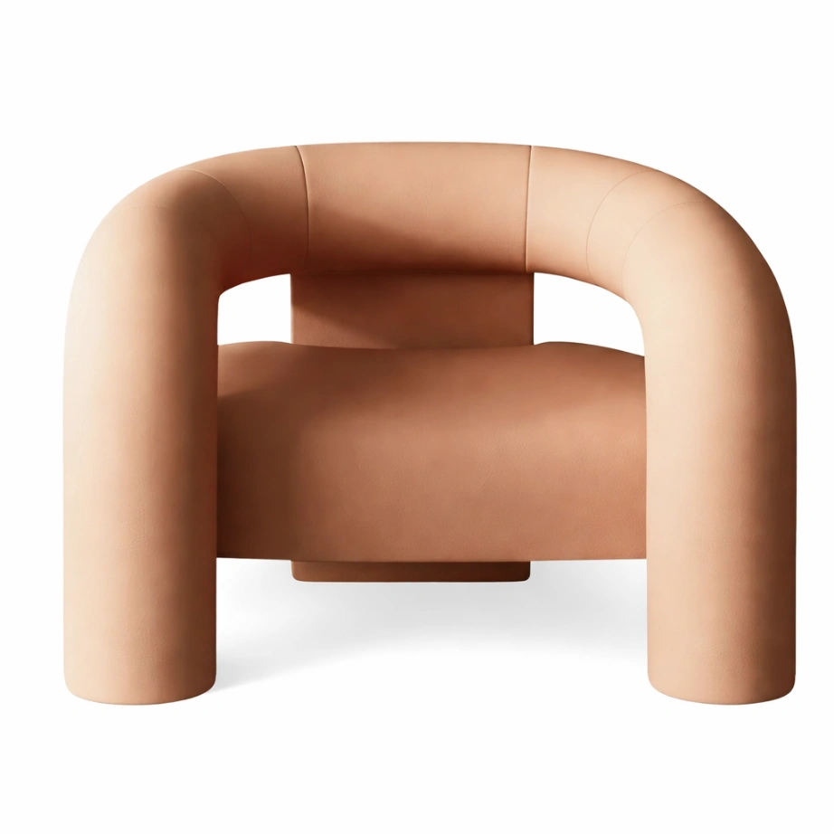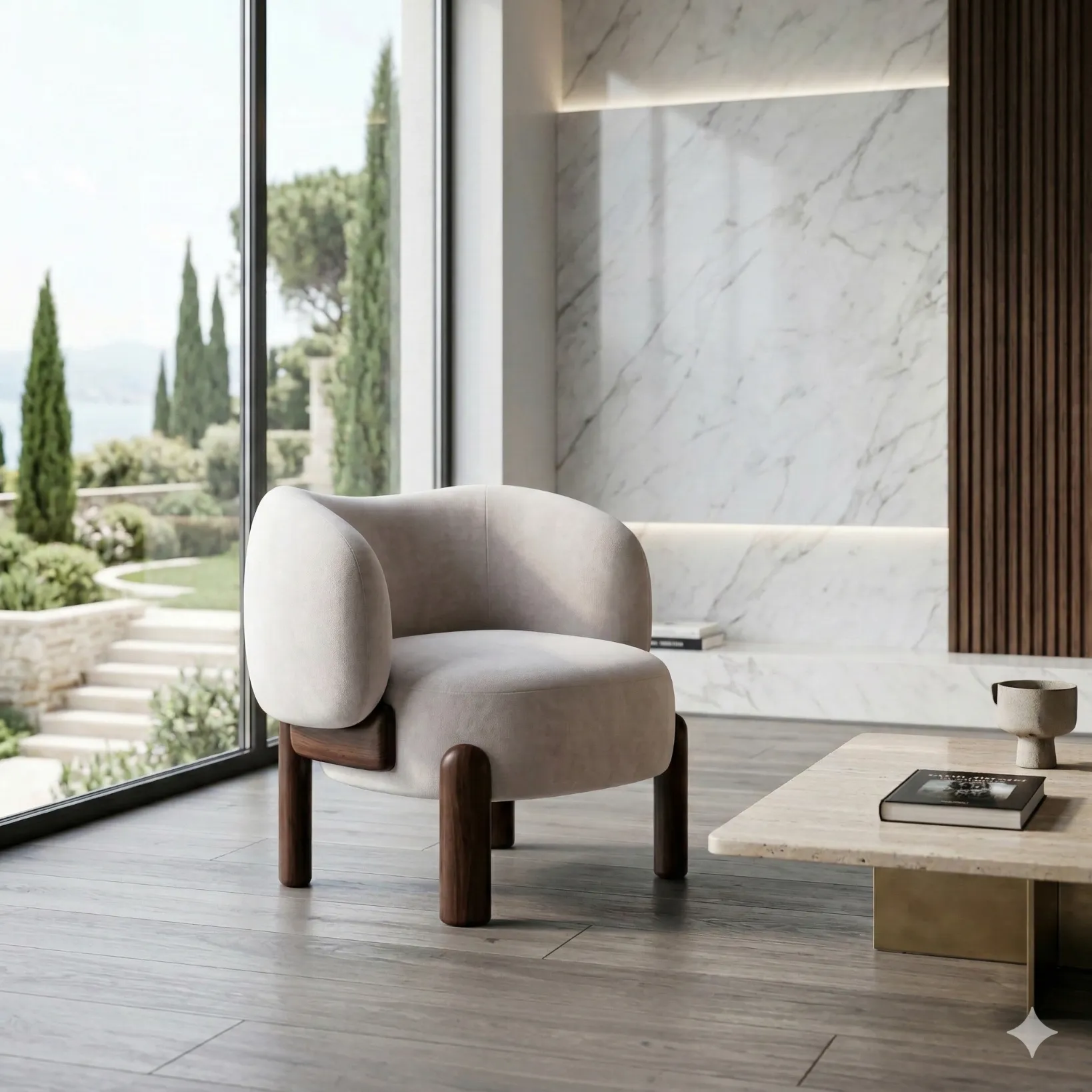 This Arcadia Armchair is defined by controlled softness: a generous oval seat and a wraparound back that curves in one continuous line, creating a relaxed, supportive cradle. The form is intentionally simple, but precise—full in volume, clean in surface, and carefully proportioned so it reads composed rather than oversized. What distinguishes the piece is the structure beneath: rounded timber legs and side elements that hold the upholstery like a frame, bringing architectural clarity to an otherwise fluid silhouette. In a room, it offers a quiet point of gravity—soft to the eye, disciplined in line.