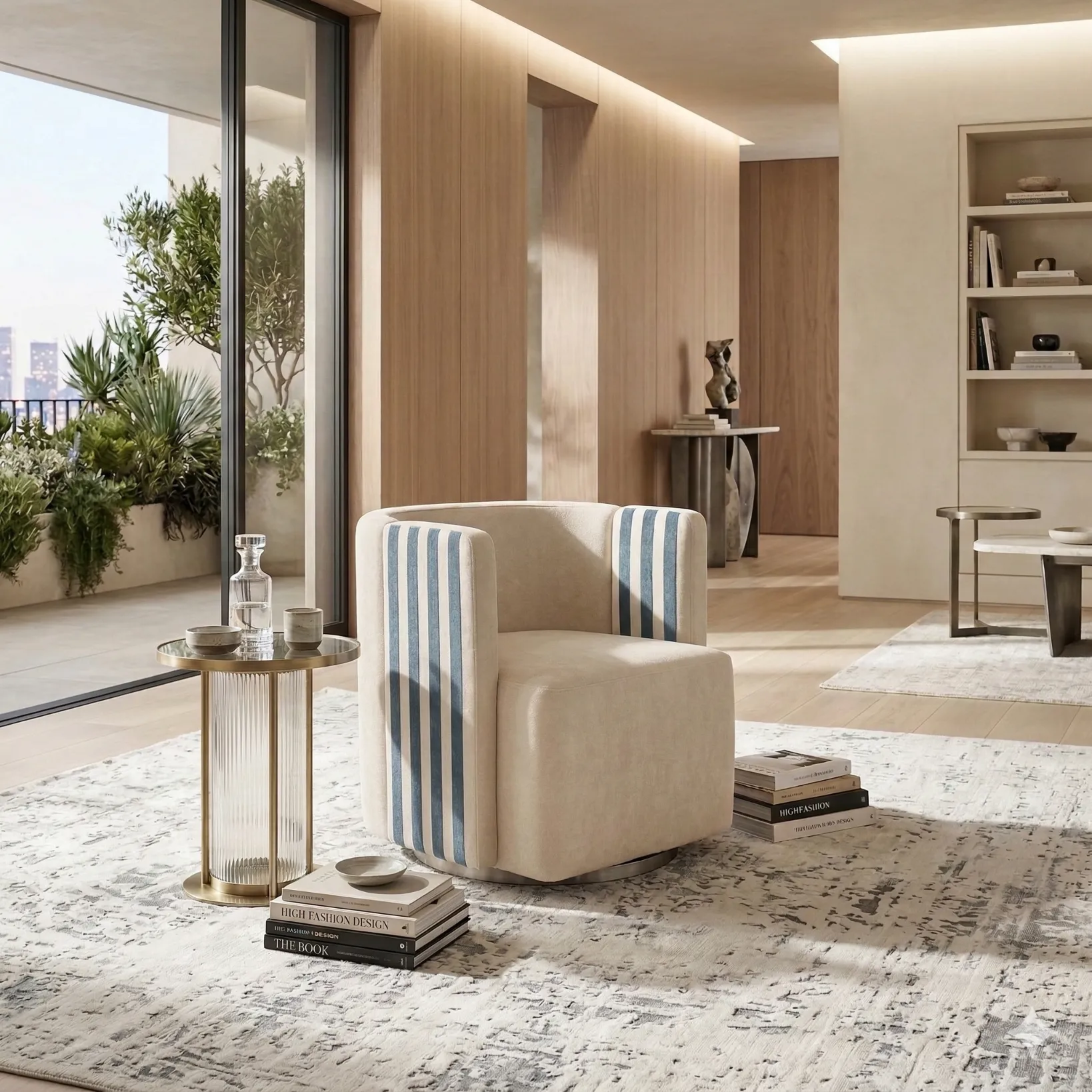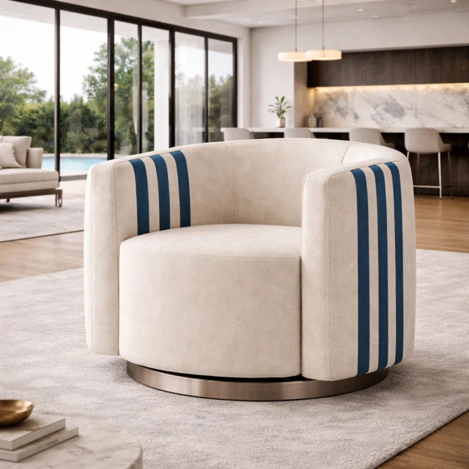 Crafted with a solid internal frame and layered cushioning shaped to maintain the chair’s rounded profile and clean edge lines. Shown in a light, refined upholstery—suggestive of a cotton-linen blend or tight bouclé—paired with contrasting striped inset panels that read as a woven textile with a firmer hand. The swivel base appears in a satin metal finish, likely brushed stainless or a muted nickel tone, chosen for restraint and durability.