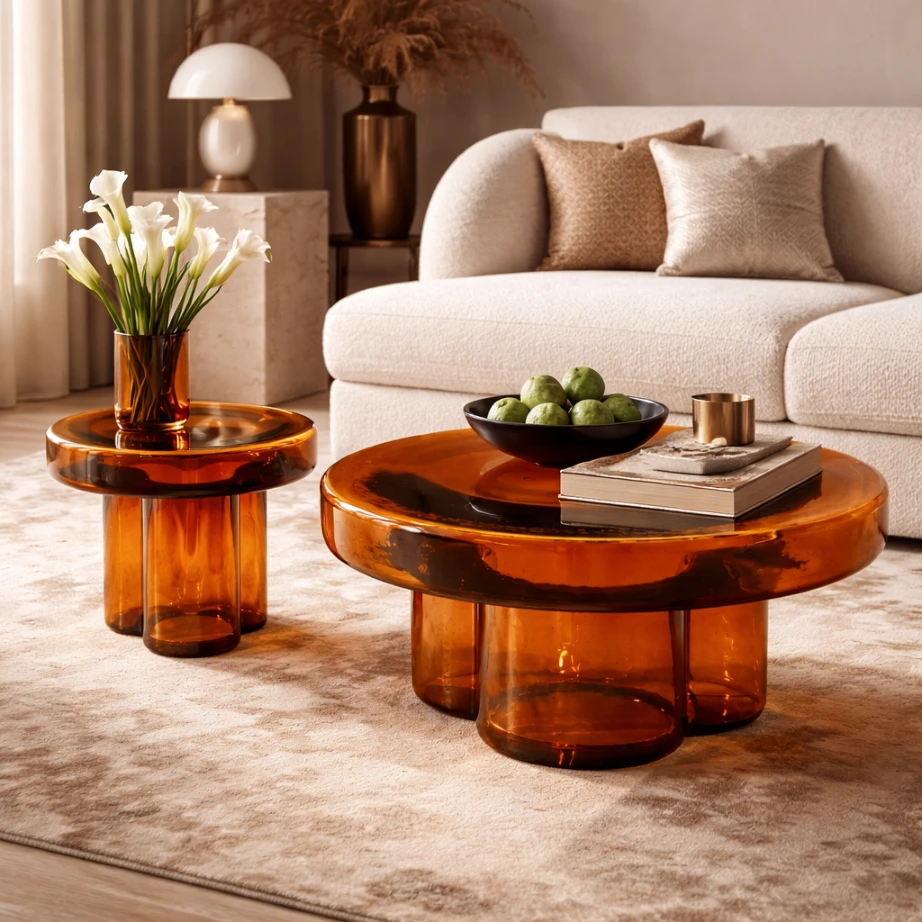 This Avola Side Tables set is composed as two luminous discs held on clustered glass columns. The geometry is simple—round tops with generous thickness and softened edges—but the material transforms the form. Amber glass concentrates light at the rim, then deepens toward the base, creating a quiet gradient of tone and a sense of depth through the structure. The cylindrical supports read as a small colonnade, giving the pieces architectural clarity while keeping the overall presence light. Used together, they create a balanced, layered composition; used apart, each table remains a calm sculptural anchor.