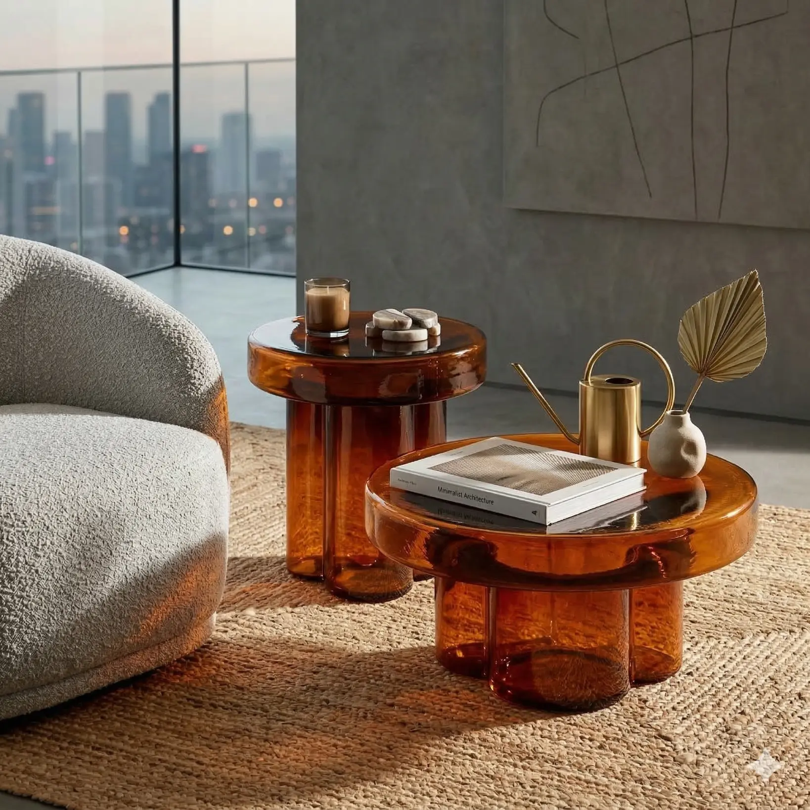 Available in a curated range of glass tones, from lighter honey ambers to deeper smoked hues, with customization across sizing and table pairing configurations. Finish options can be specified from high-polish to slightly softened sheen, allowing the tables to read more luminous and graphic or more quiet and tonal, while preserving their proportion and balance.