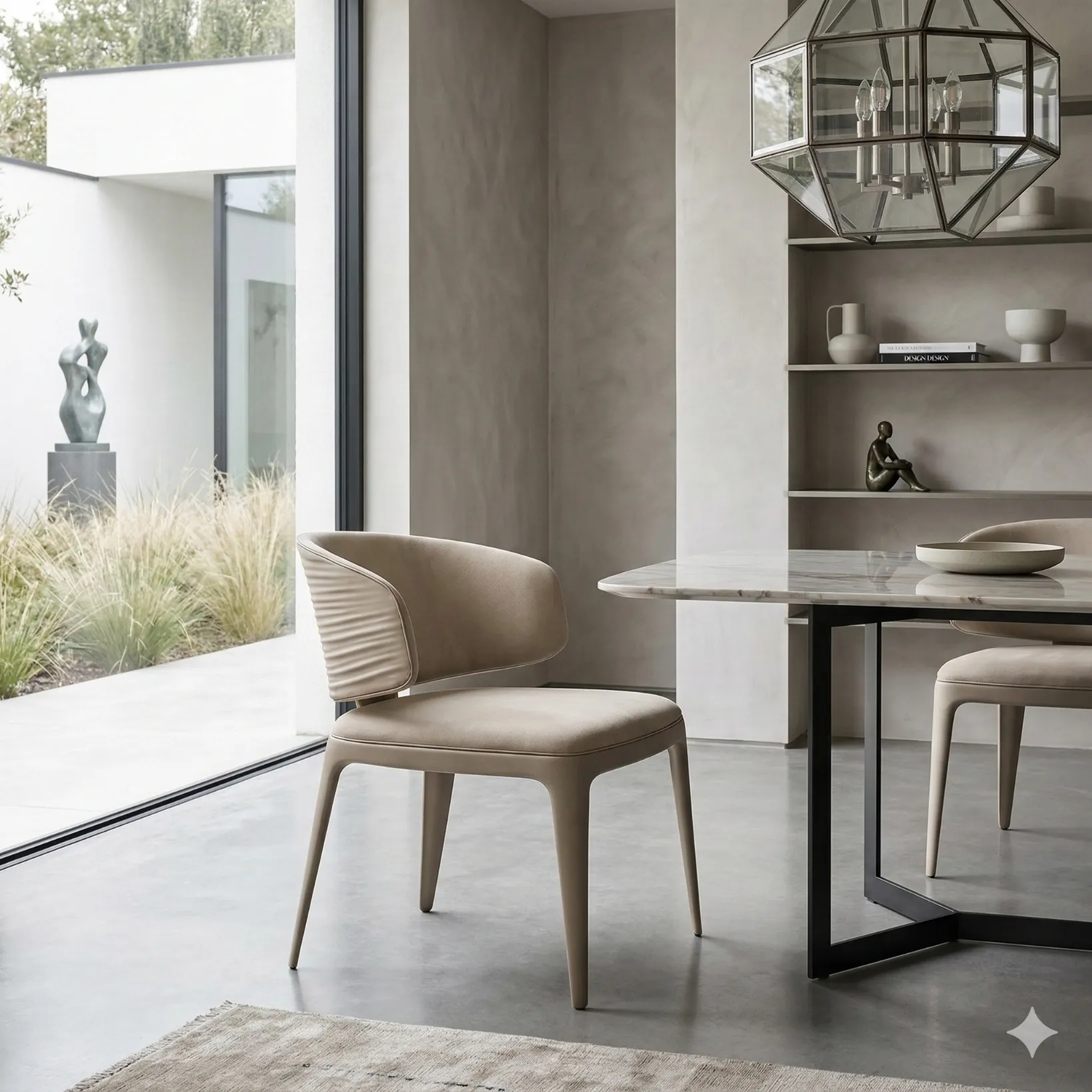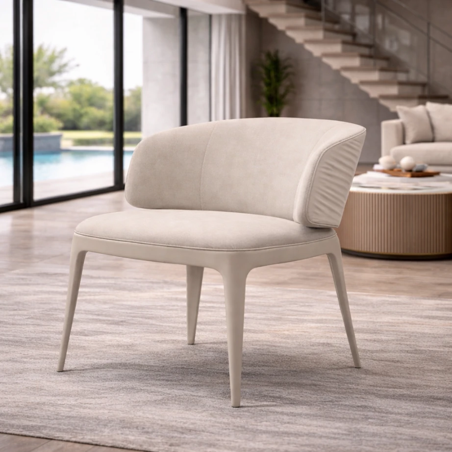 This Bianca Dining Chair is defined by quiet geometry and careful separation of volumes. A broad seat sits on slender integrated legs, while the backrest appears to hover—set slightly apart to create lightness and architectural clarity. The profile is calm and compact, with soft radii that keep the piece tactile without losing line. A pleated insert on the back introduces a controlled cadence, catching light in fine bands and giving the chair a subtle sense of depth. Tonal upholstery and minimal detailing keep the overall presence restrained, allowing proportion and balance to lead.
