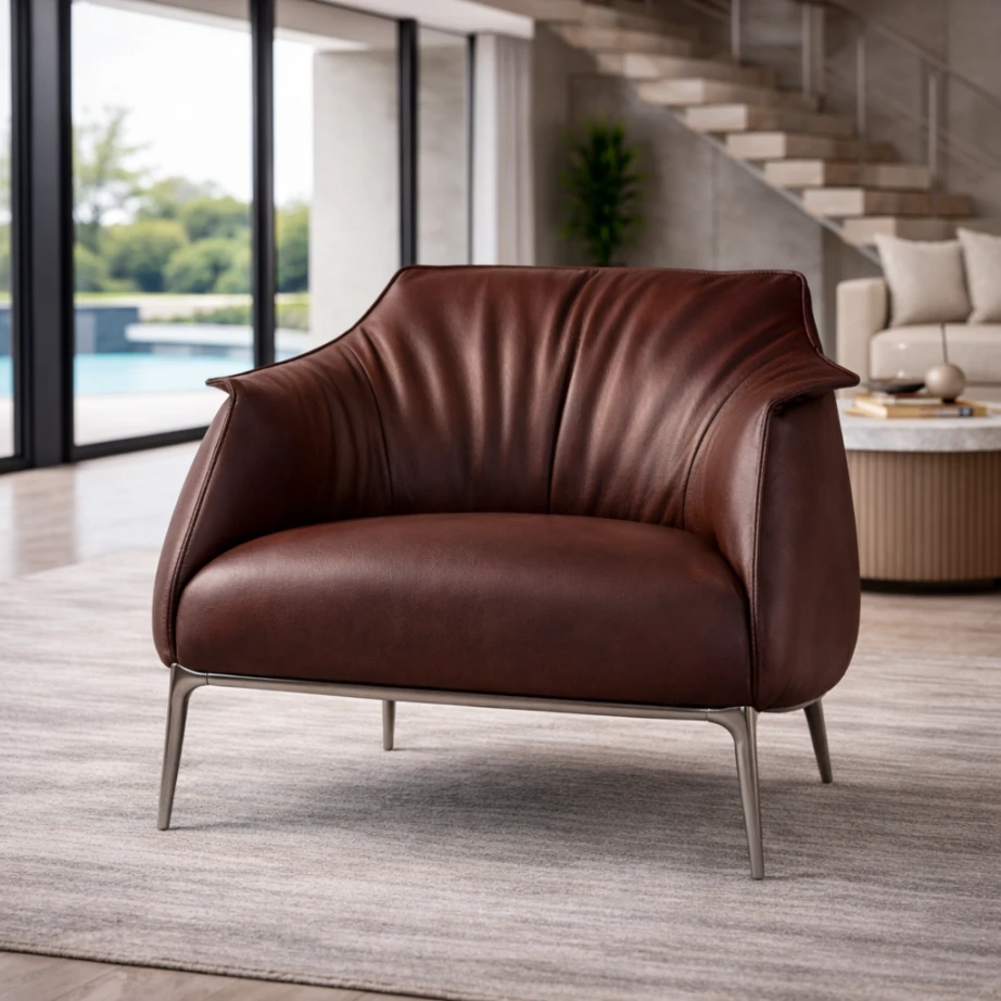 Crafted with a solid internal frame and layered cushioning shaped to maintain the chair’s curved silhouette and defined seat edge. Shown in a rich brown leather with a natural grain and a soft sheen, selected to articulate the pleated back and the smooth seat plane as distinct tactile zones. The legs appear in a dark metal finish—likely powder-coated steel or brushed metal—kept deliberately slender to offset the chair’s volume and reinforce its balanced stance.