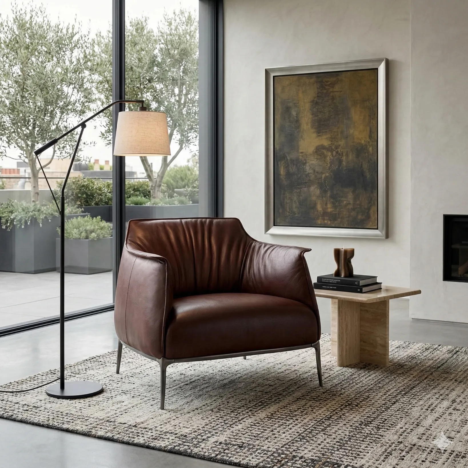 Available in a curated range of leathers and select fabrics, with customization across color, grain character, and stitch definition. Metal leg finishes can be specified in alternative tones to adjust contrast and warmth, while preserving the chair’s architectural clarity and composed proportions.