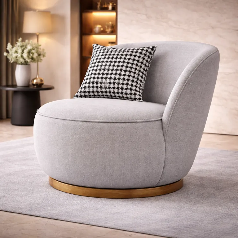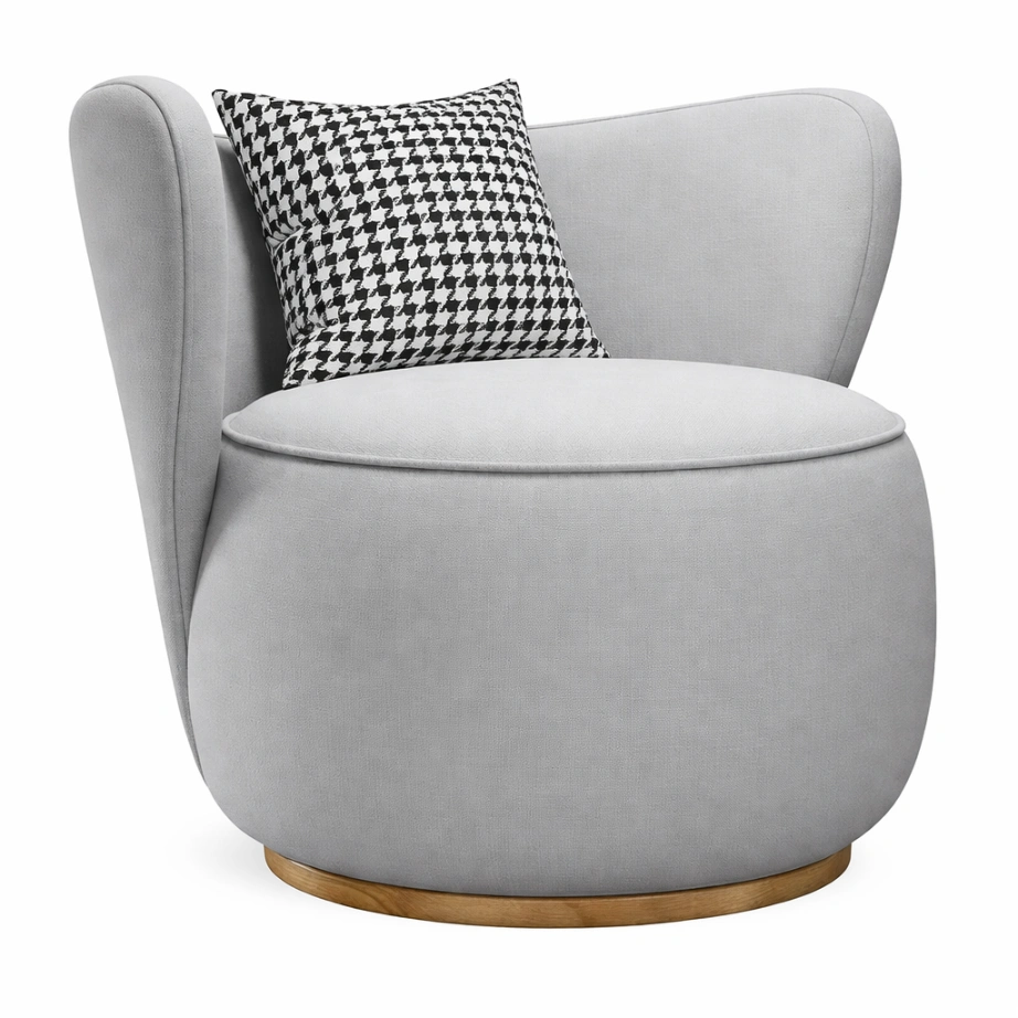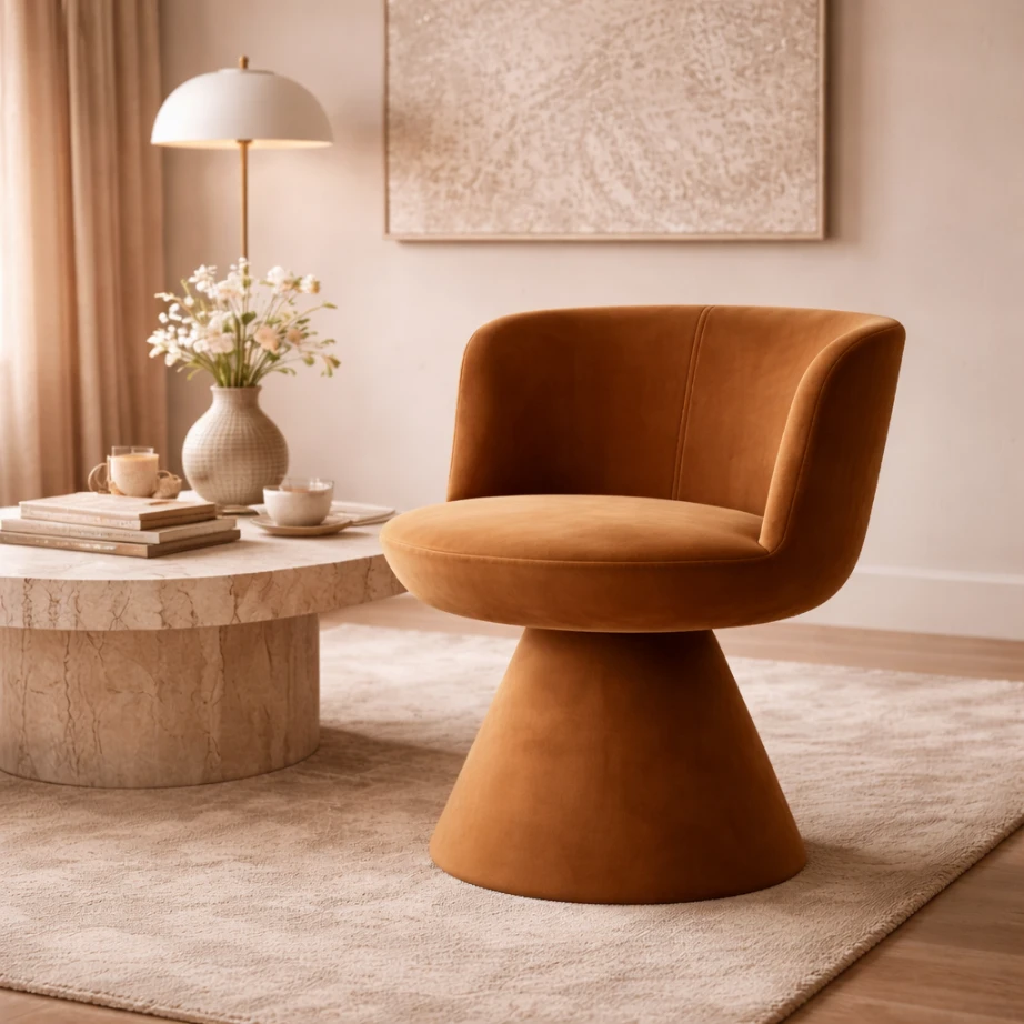 This Elena Lounge / Accent Chair is reduced to essential geometry: a curved back that wraps gently around the body, set above a clean, disc-like seat and a conical pedestal. The lines are continuous and controlled, with subtle transitions that keep the silhouette smooth and legible. A single vertical seam anchors the backrest, adding just enough definition to sharpen the form without interrupting its softness. The stance is compact, but visually grounded—an object-like chair that sits comfortably in a bedroom corner, dressing area, or as a refined counterpoint within a larger seating arrangement.