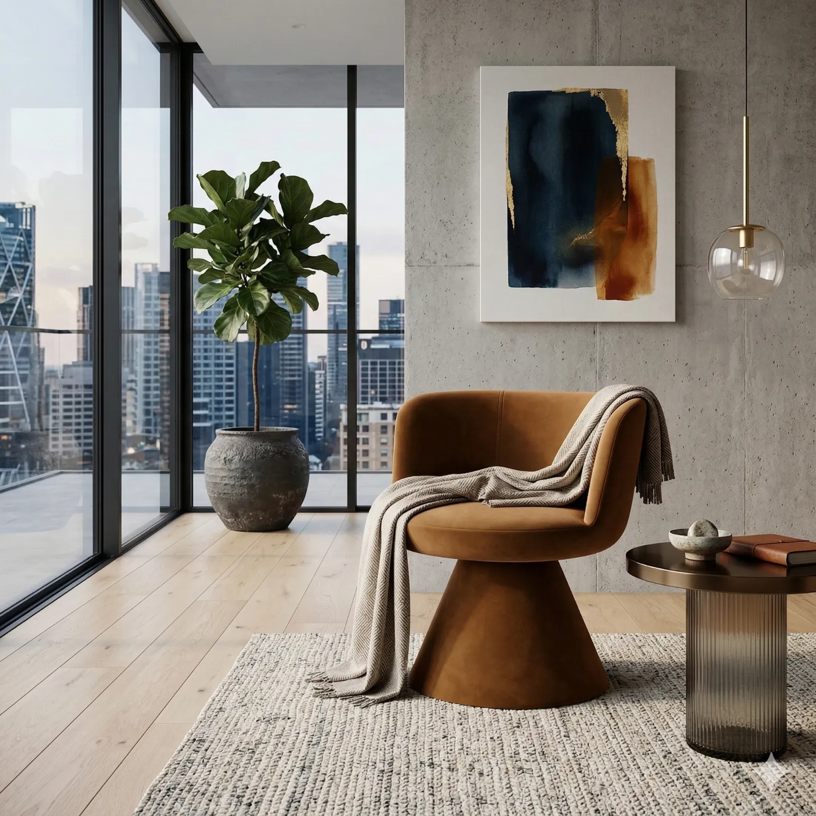 Crafted with a solid internal structure and shaped padding to maintain the chair’s clean curves and stable seat edge. Shown in a warm, matte upholstery—suggestive of a nubuck-style leather or a fine, short-pile velvet—selected to absorb light softly and highlight the piece’s architectural clarity. The base is fully upholstered for a seamless, monolithic effect, with careful tailoring that keeps seams minimal and aligned.