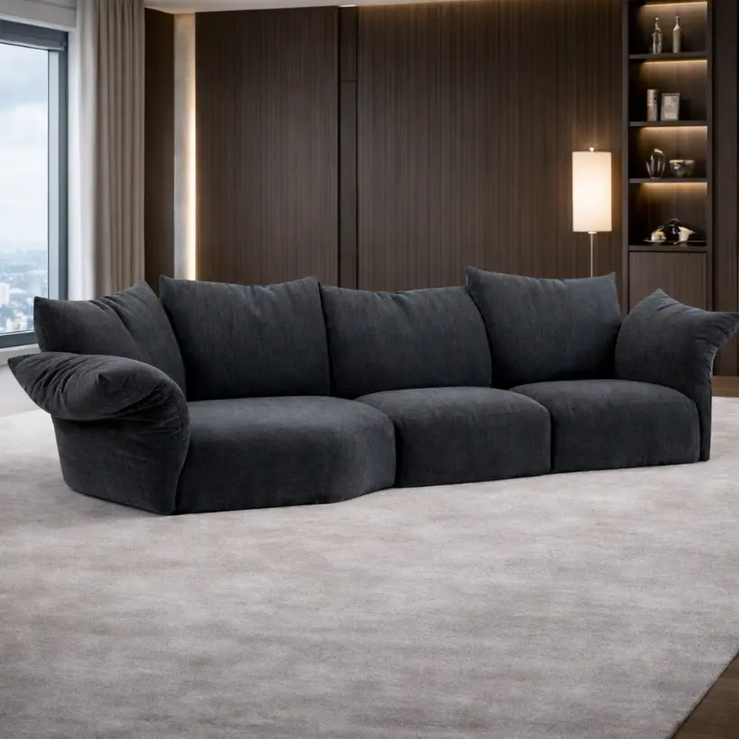 Available in a curated palette of neutral and earth tones, with customization possible across upholstery choice, stitching definition, and overall length. The integrated upholstered base reinforces balance and architectural continuity, keeping the sofa visually composed from every angle.