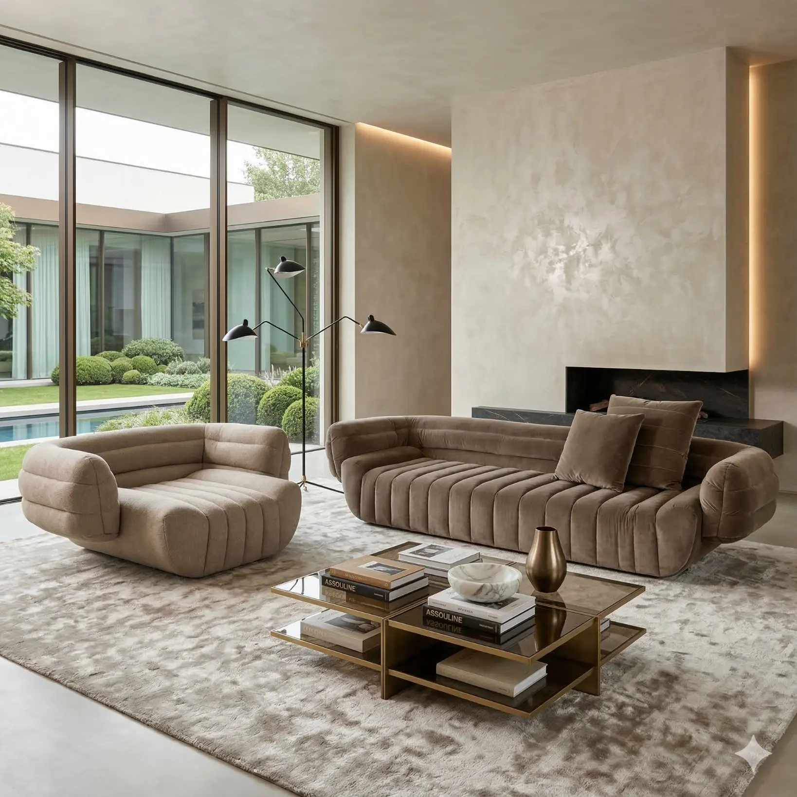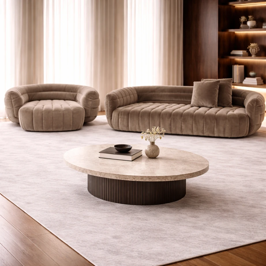 The backrest is subtly recessed, allowing the upholstery volume to read as a single sculpted gesture. In a warm taupe velvet, the sofa holds light with restraint, emphasizing softness while maintaining clarity of form. The overall presence is calm and grounded—structured through rhythm, softened through material.