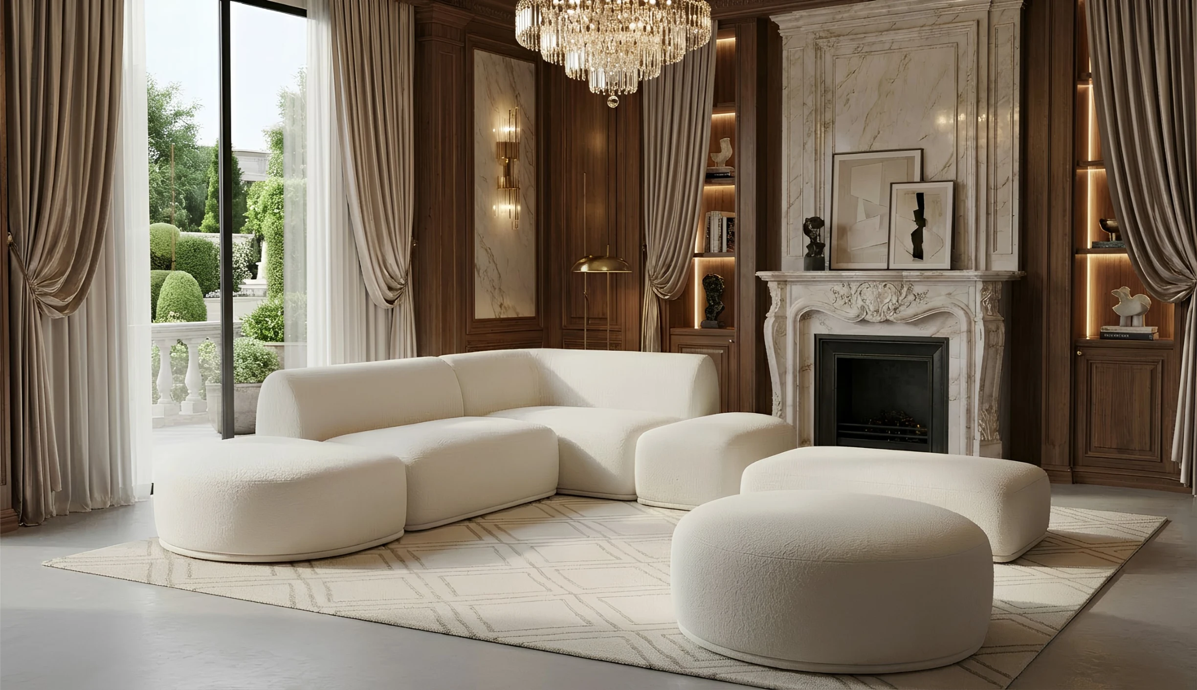 This Garofano modular sofa is conceived as a flexible composition of sculpted forms. Each element is defined by softened edges and generous seat depth, creating a continuous flow across the configuration. The corner module transitions seamlessly, maintaining visual clarity without interruption.