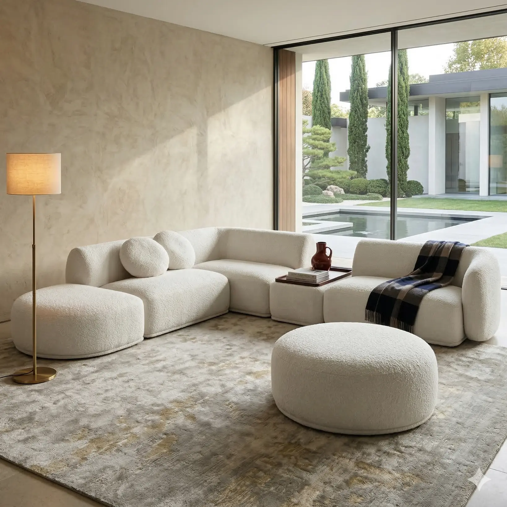 Constructed with a solid internal frame and layered high-density cushioning for durability and structured comfort. Fully upholstered in refined boucle or available in a curated range of textured fabrics and soft leathers. Shown in a light ivory finish that emphasizes volume and proportion.