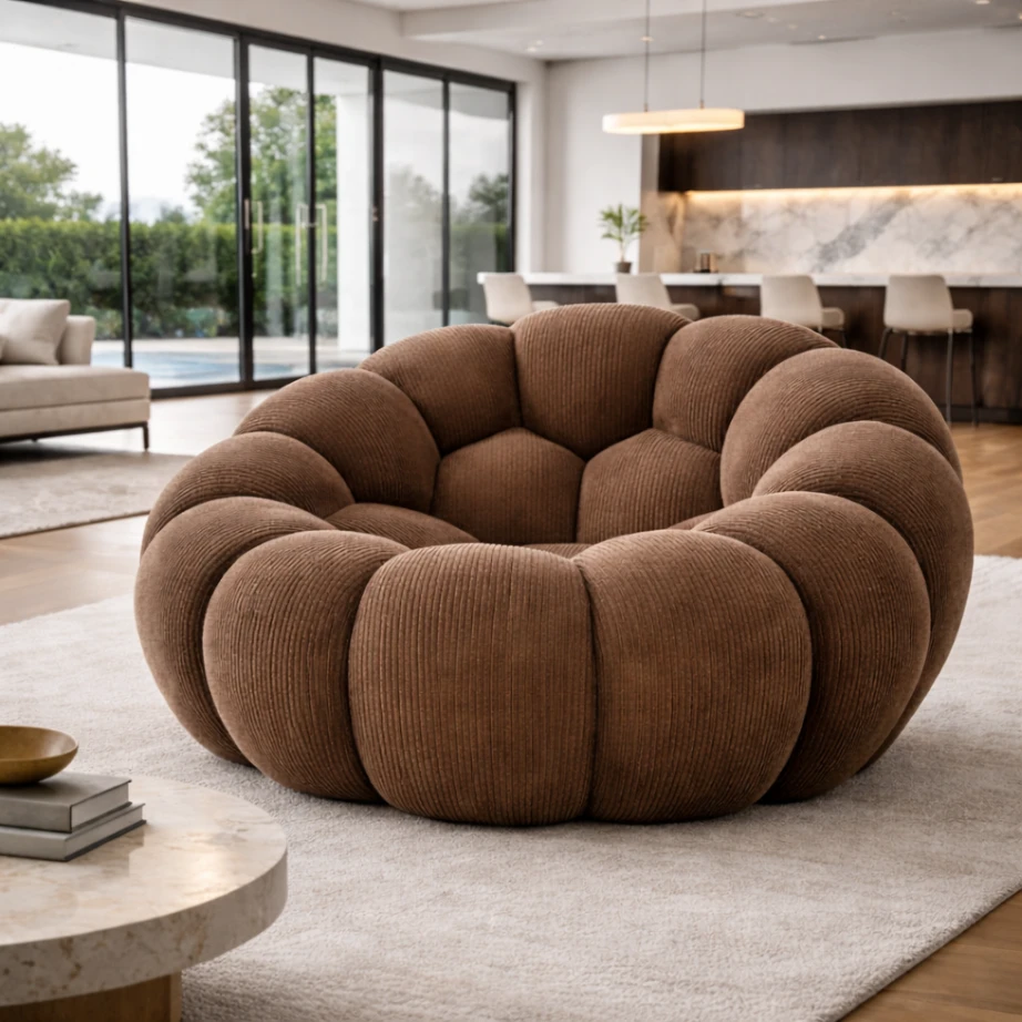 This Hellas Lounge Chair is built as an enclosing form: a generous circular perimeter that gathers into a deep, supportive seat. The outer body is articulated through vertical channels—softly structured segments that hold their line and give the chair architectural clarity. Inside, the back transitions into subtle facets, shaping the posture without interrupting the continuity of the silhouette. Its proportions are intentionally low and wide, reading as grounded and composed rather than oversized. The ribbed upholstery amplifies the geometry, catching light in fine bands and reinforcing the chair’s disciplined softness.