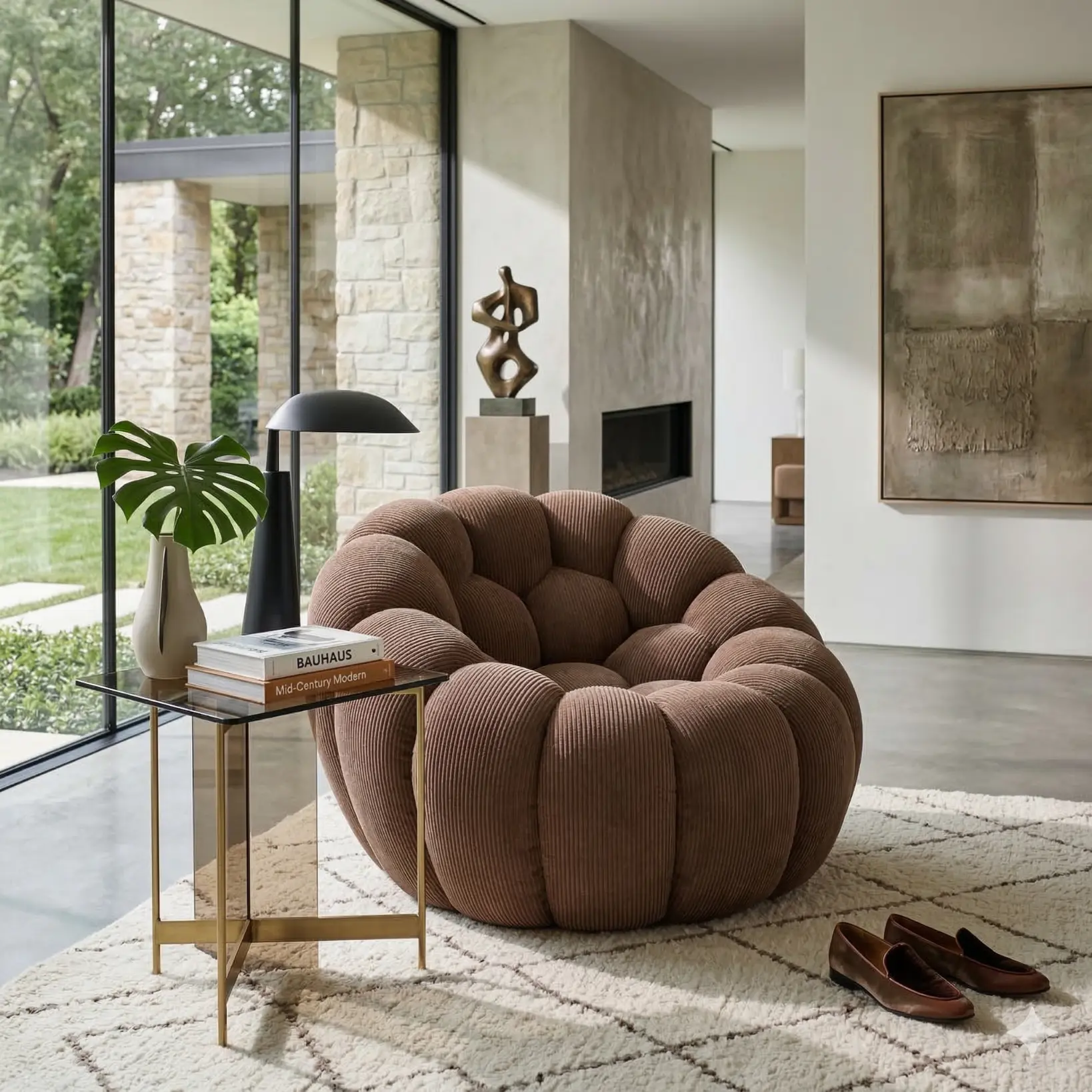 This Hellas Lounge Chair is built as an enclosing form: a generous circular perimeter that gathers into a deep, supportive seat. The outer body is articulated through vertical channels—softly structured segments that hold their line and give the chair architectural clarity. Inside, the back transitions into subtle facets, shaping the posture without interrupting the continuity of the silhouette. Its proportions are intentionally low and wide, reading as grounded and composed rather than oversized. The ribbed upholstery amplifies the geometry, catching light in fine bands and reinforcing the chair’s disciplined softness.