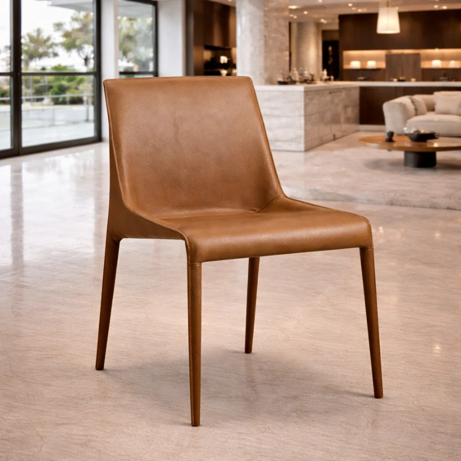 This Lucia Dining Chair is reduced to essentials: a single continuous surface that moves from back to seat with a calm, controlled incline. The silhouette is slim and disciplined, with a softly rounded perimeter that keeps the geometry tactile rather than sharp. Its proportions are carefully balanced—compact enough for dining, refined enough to stand alone—while the integrated legs extend naturally from the upholstered body, maintaining visual continuity. Stitching is kept minimal and aligned to the form, allowing the leather’s surface and the chair’s architectural line to carry the presence.