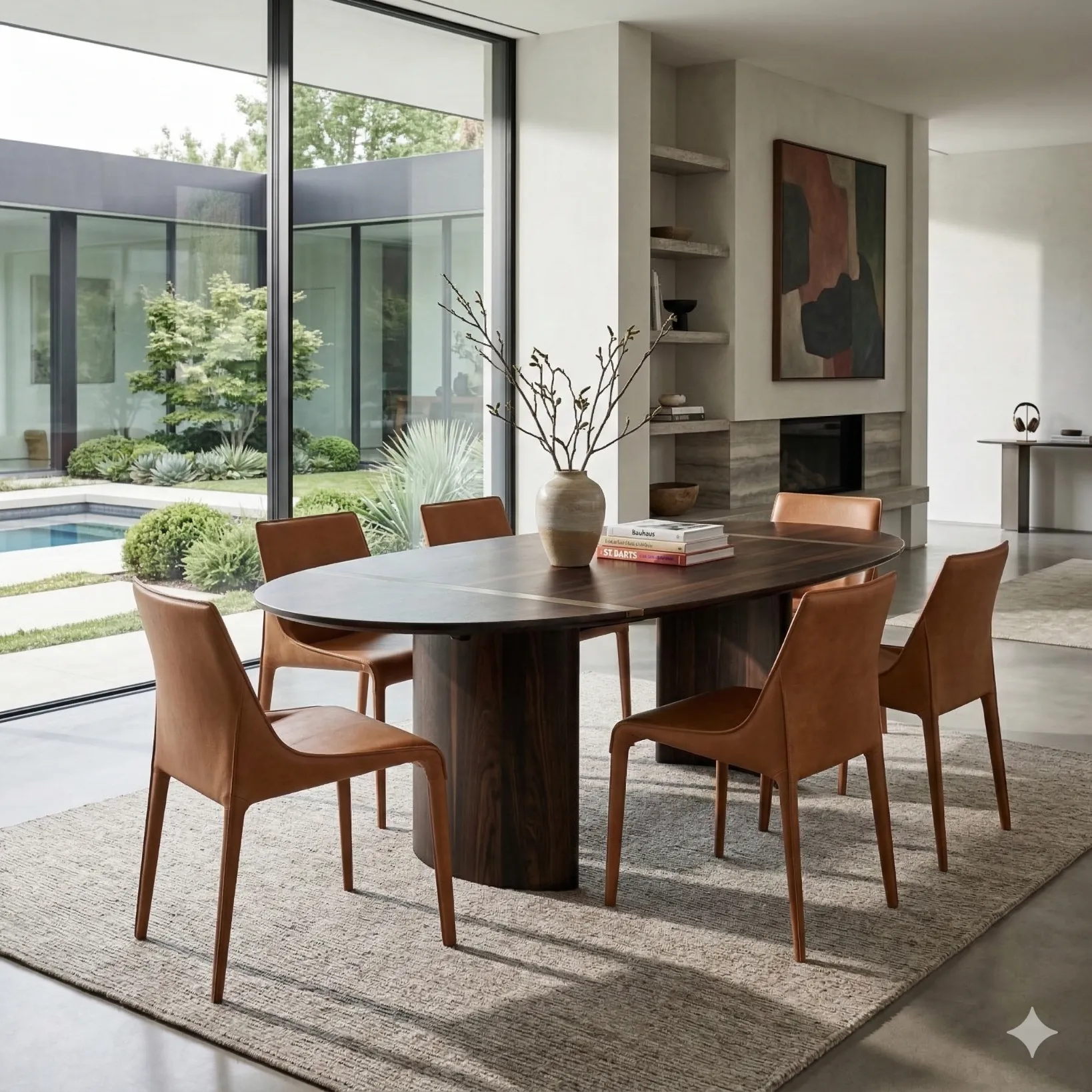 Crafted with a solid internal structure and shaped padding to maintain the chair’s slim profile and clean transitions. Shown in smooth leather with a soft sheen, selected for its supple hand and ability to hold a precise edge line. Seams are placed sparingly—typically along structural junctions—to preserve the purity of the silhouette and reinforce long-term stability.