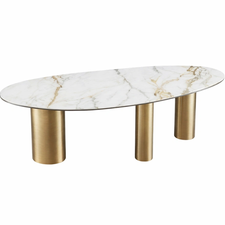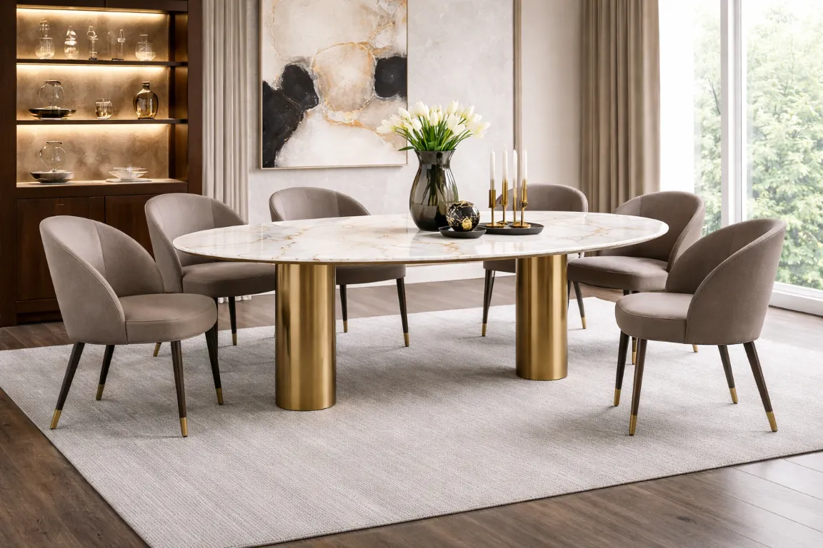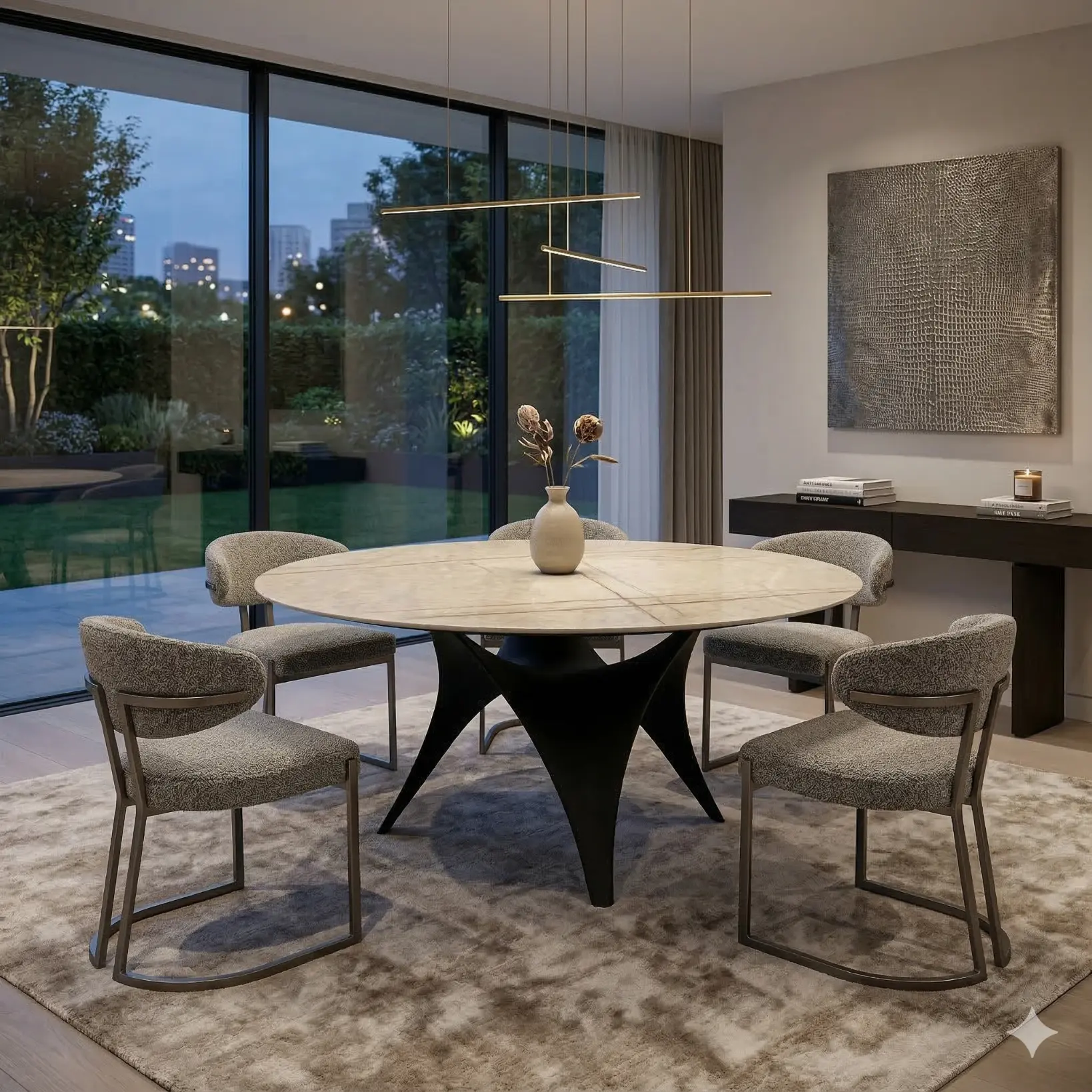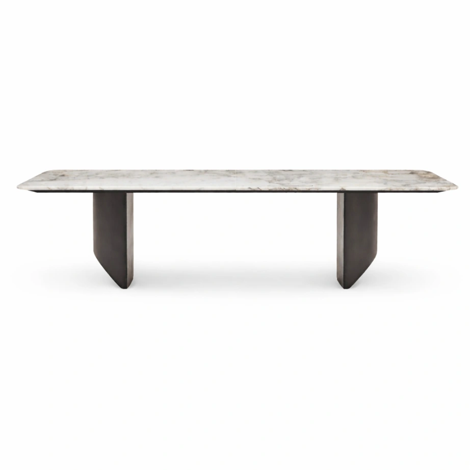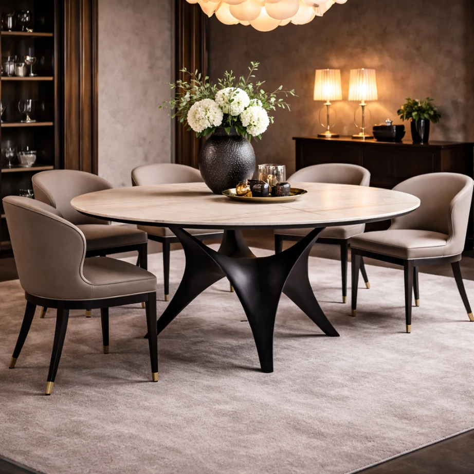 This Madonie Dining Table is defined by a disciplined interplay of plane and structure. The top reads as a quiet stone disc—thin at the edge, softly composed—designed to keep the profile light despite its material weight. Beneath, a three-finned base converges at the center in a sculptural cross-like geometry, creating rhythm through negative space and giving the table a precise, architectural clarity. The contrast is deliberate: pale stone above, dark structure below. In the room, it feels grounded without heaviness, with generous leg clearance and a centered stance that suits intimate dining arrangements.
