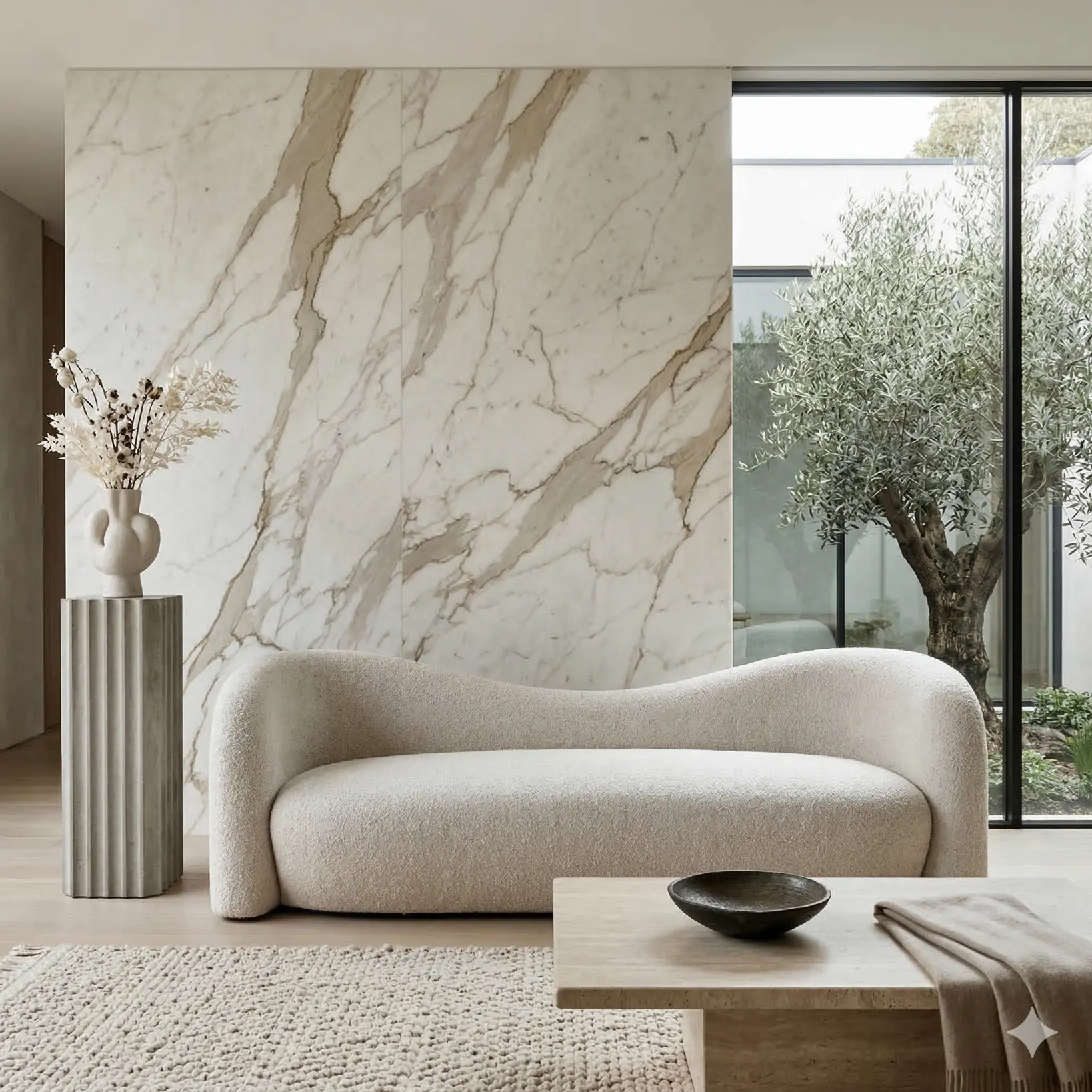 Constructed with a solid internal frame and layered cushioning to maintain structure and softness over time. Fully upholstered in refined boucle, wool-blend textiles, or available in a curated leather selection. Shown in a light neutral fabric that highlights the sofa’s sculptural clarity.