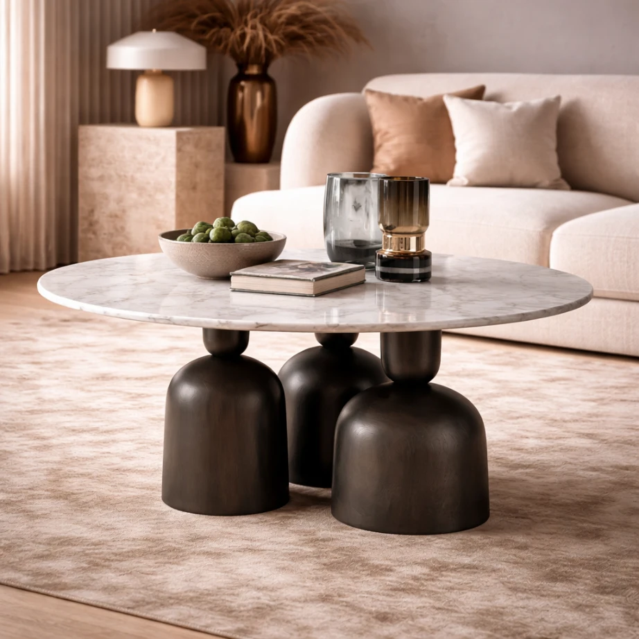 Crafted with a marble top—shown in a light stone with soft grey veining—finished honed for a matte touch that reduces glare and emphasizes depth. The base appears in dark finished wood or metal with a soft matte surface, shaped into three rounded pedestal forms for stability and a sculptural read. Edge finishing is refined and slightly softened, while junctions are kept clean to preserve the table’s architectural clarity.