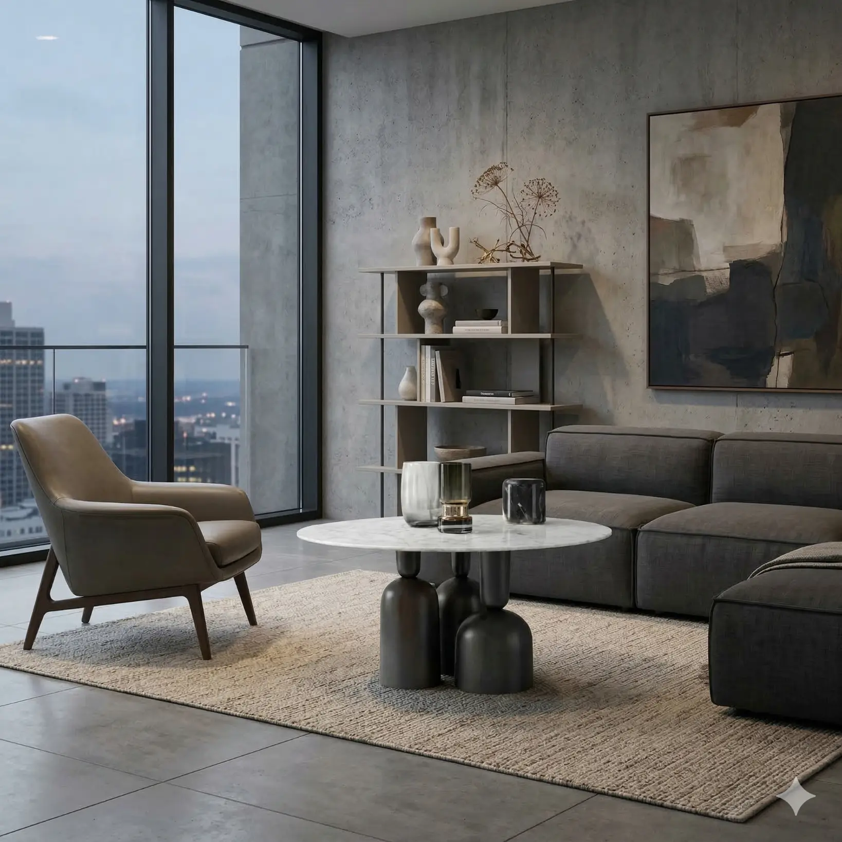 Available in a curated range of marbles and select stones, with base finishes offered in alternative dark tones and warm metallic treatments. Customization can include diameter and height variations, as well as honed versus lightly polished stone finishes, allowing the table to read more tonal and quiet or more contrasted while maintaining its balanced proportions.