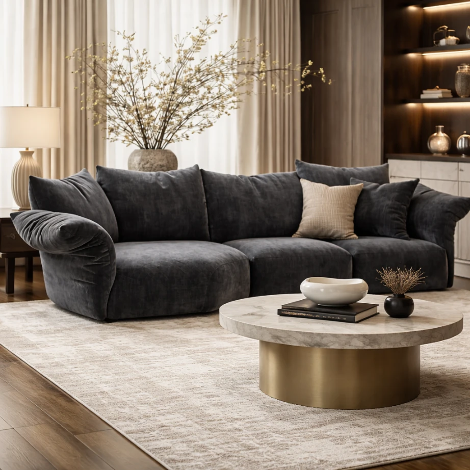 Customization options include upholstery material and tone, cushion composition, and proportional adjustments in length. The result is a sofa defined by tactile contrast, balanced geometry, and an understated architectural presence suited to contemporary interiors.