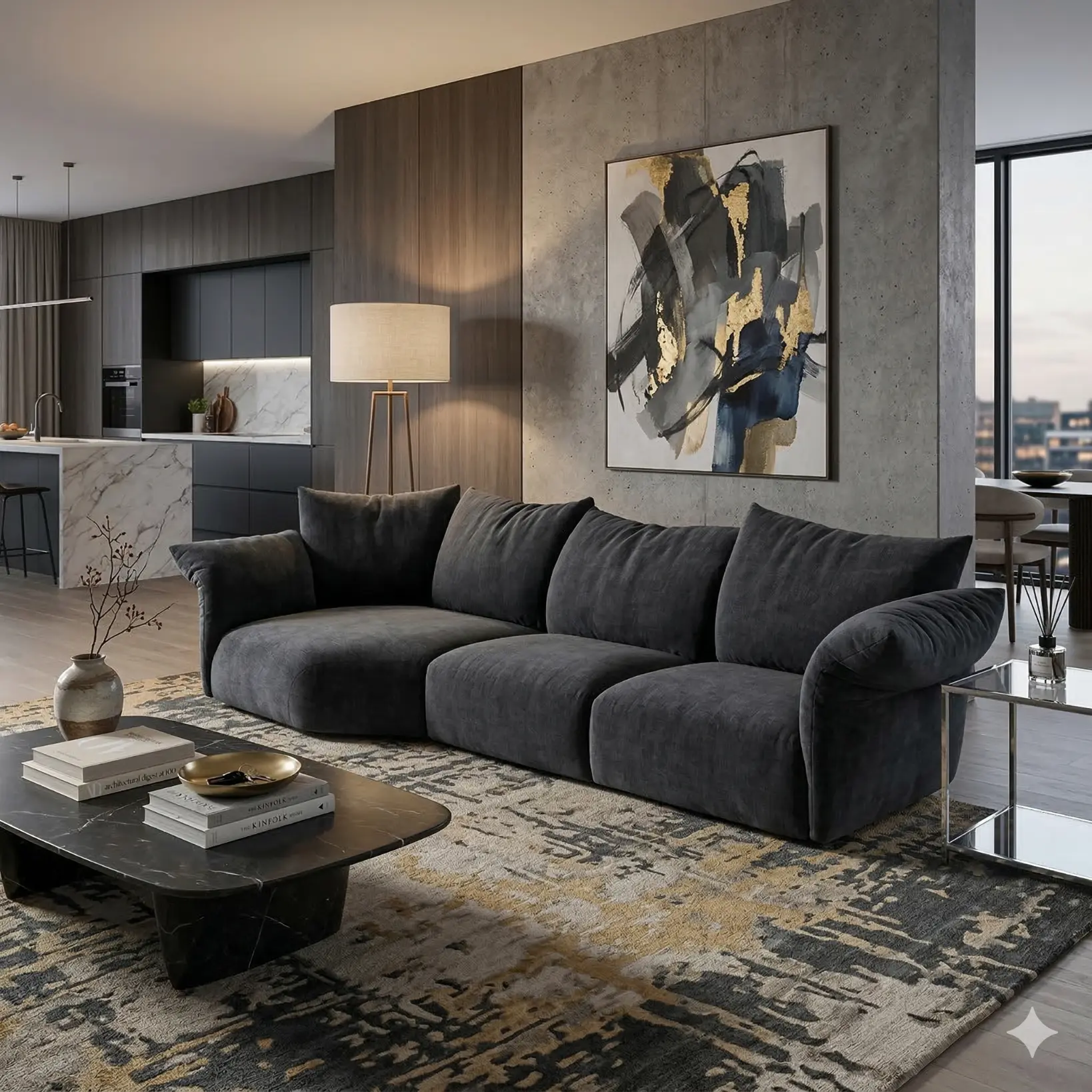 The back cushions sit generously against the frame, adding vertical rhythm and relaxed support. Upholstered in a deep charcoal textile, the piece gains visual weight and understated presence. The silhouette remains low and horizontal, reinforcing architectural balance while offering a generous, lounge-forward posture.