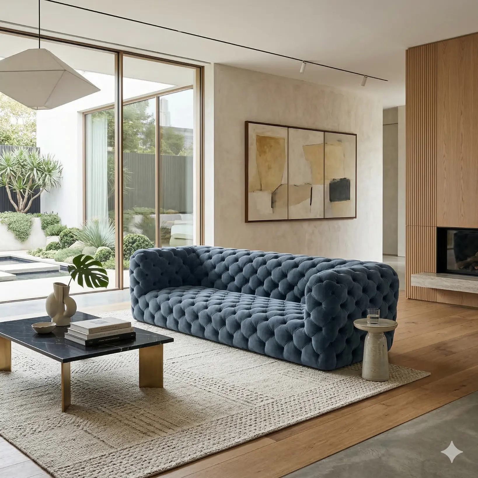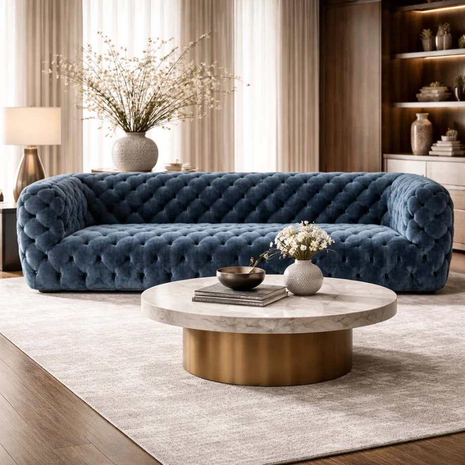 Tufting depth, upholstery selection, and proportional adjustments may be customized to suit different interior contexts. The result is a sofa defined by balance, tactile richness, and architectural clarity expressed through disciplined surface detailing.