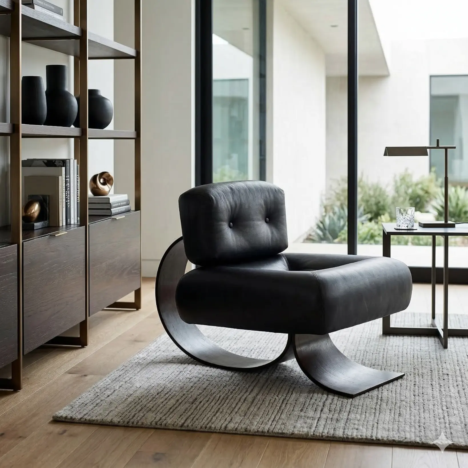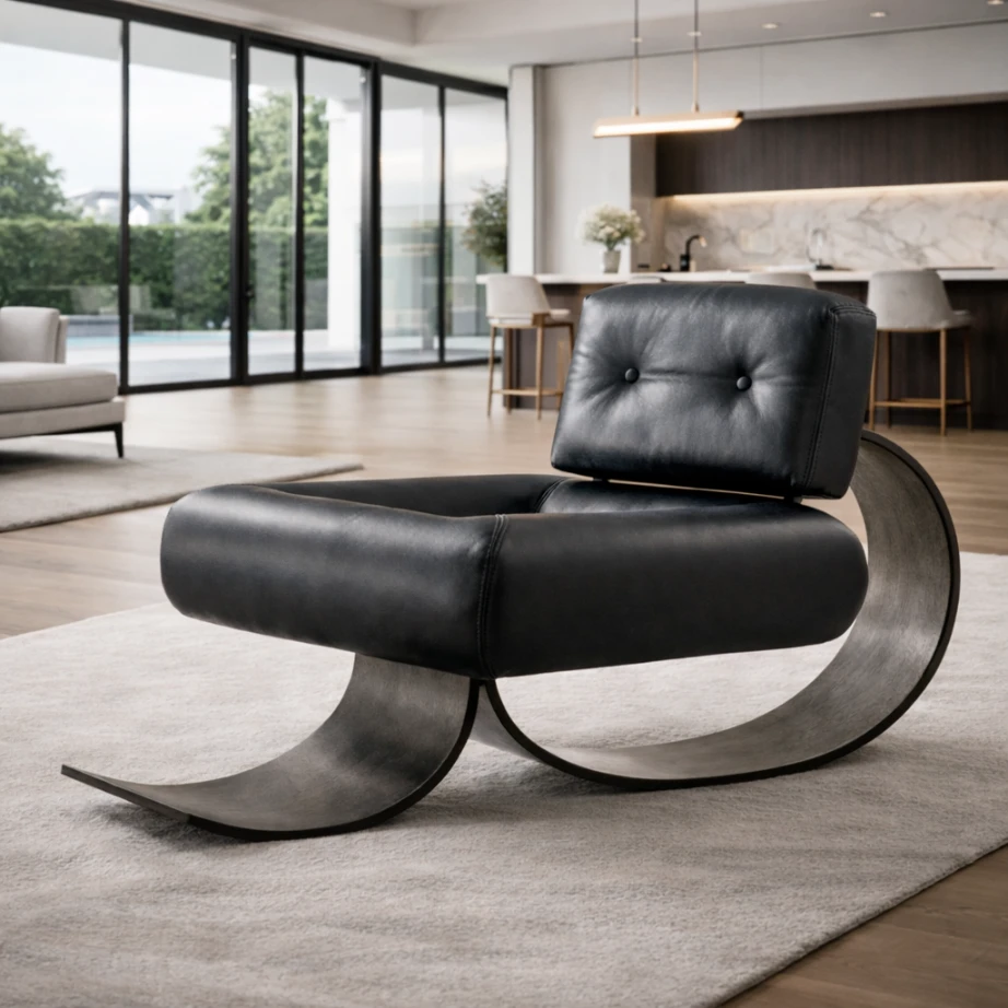 Crafted with a solid internal frame and layered cushioning designed to maintain the seat’s defined thickness and smooth contour. Shown upholstered in a matte black leather, selected for its soft hand and controlled sheen, with clean seam placement that preserves the chair’s sculptural clarity. The rocking base appears to be solid wood—likely walnut or dark-stained oak—formed into continuous curved runners with a refined edge profile, engineered for a steady, measured rock.