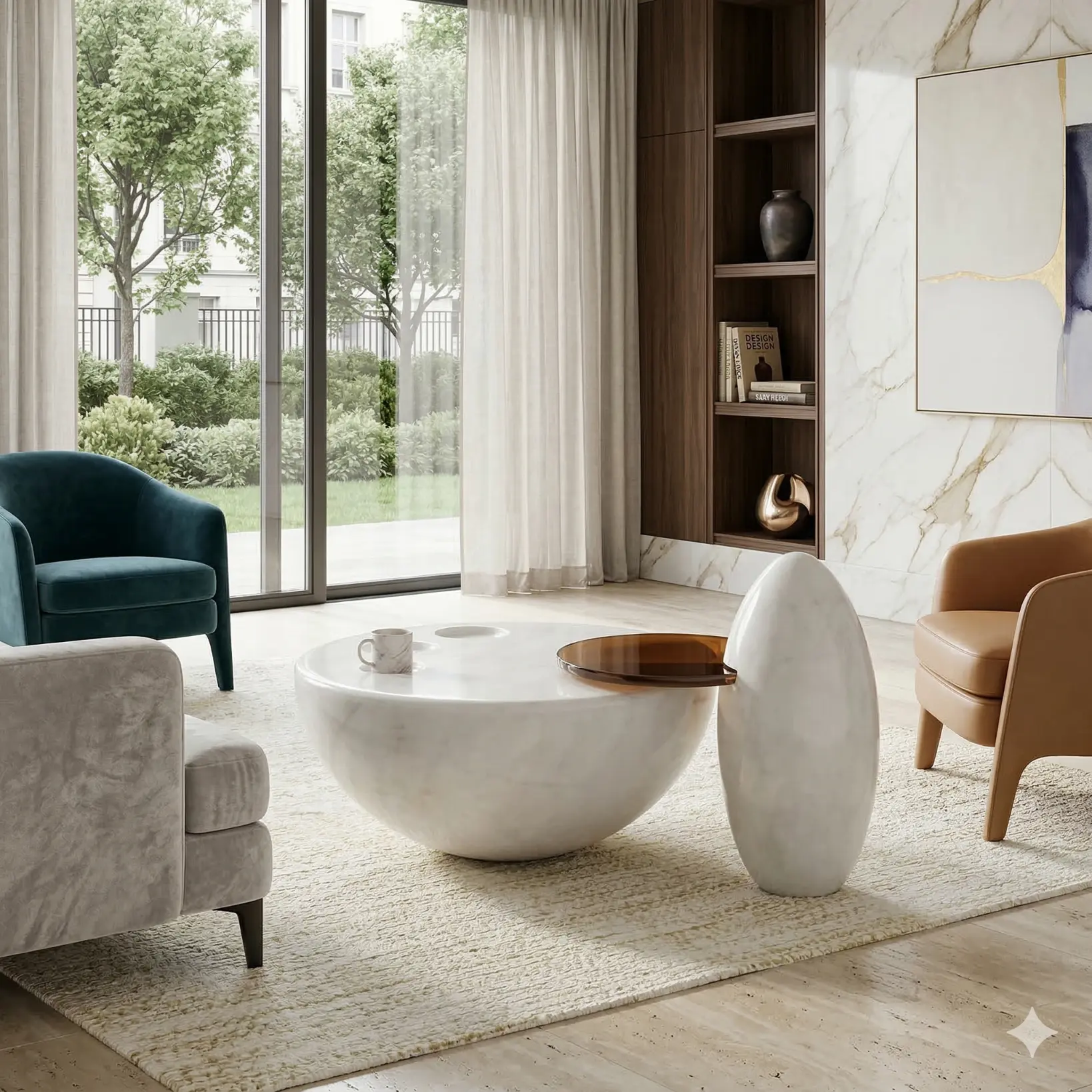 This Ortigia Side / Coffee Table reads as carved architecture. A large, rounded stone volume forms the primary surface—low, continuous, and softly radiused—designed to sit grounded within a seating area. The top is articulated by circular recesses, creating a measured rhythm and discreet containment without breaking the purity of the plane. To one side, a slender vertical element rises as a companion monolith, holding a darker tray surface that slides into the composition and introduces a second material note. The overall presence is quiet and precise: mass balanced by gentle curvature, and detail expressed through proportion, negative space, and tactile contrast.