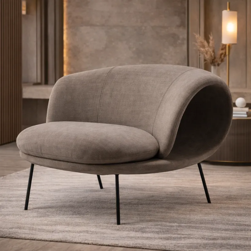 Crafted with a solid internal frame and multi-density cushioning shaped to maintain the chair’s continuous curve and defined seat edge. Shown in a matte, woven upholstery—suggestive of a linen blend or fine wool—selected for its subtle texture and even light absorption across the rounded surfaces. The legs appear in dark powder-coated metal, kept slender to emphasize the chair’s soft volume while providing stable, precise support.