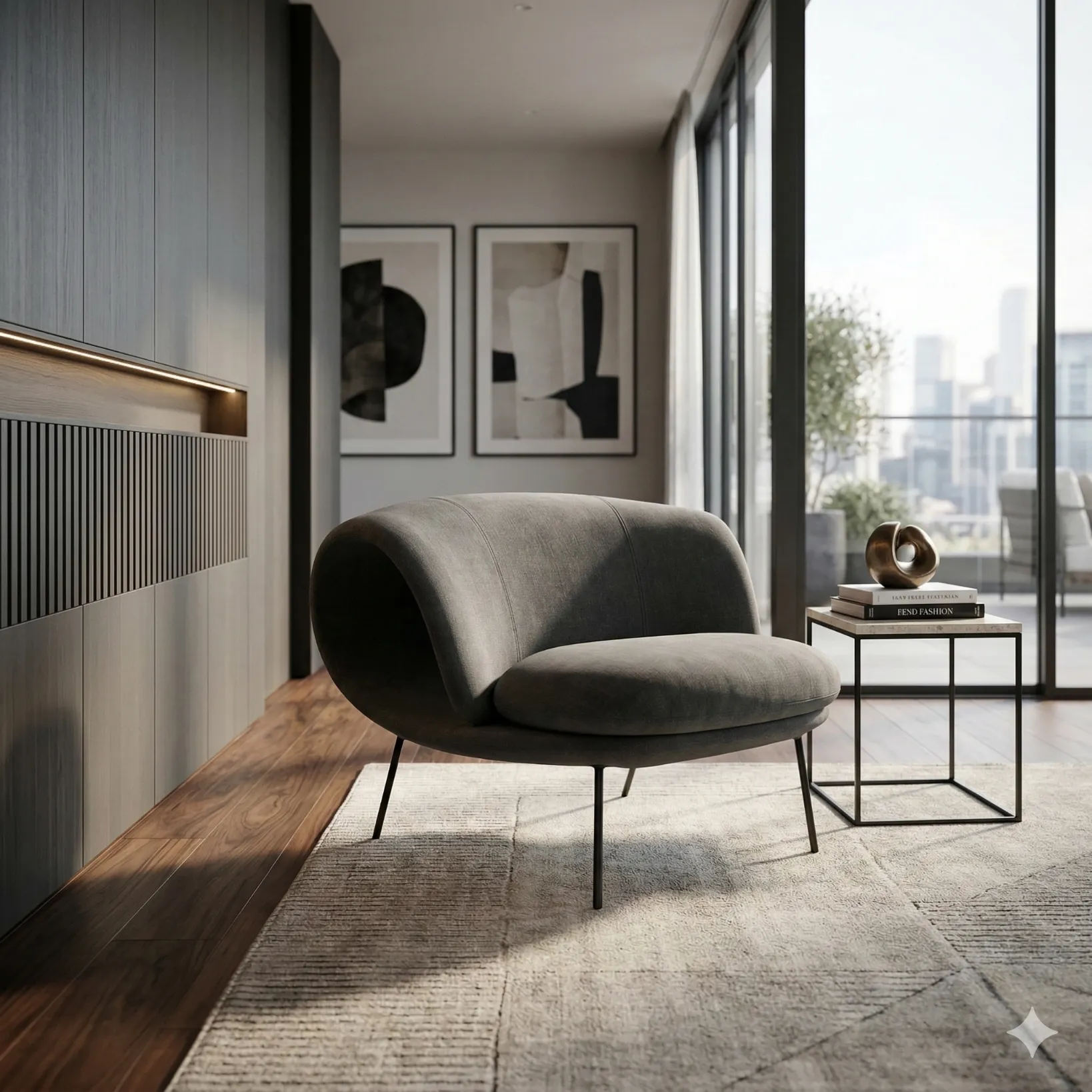 Available in a curated range of fabrics and leathers, with customization across upholstery tone, texture, and stitch definition. Leg finishes can be specified in discreet metal tones to adjust contrast and visual temperature, while preserving the chair’s architectural clarity and balanced proportions.
