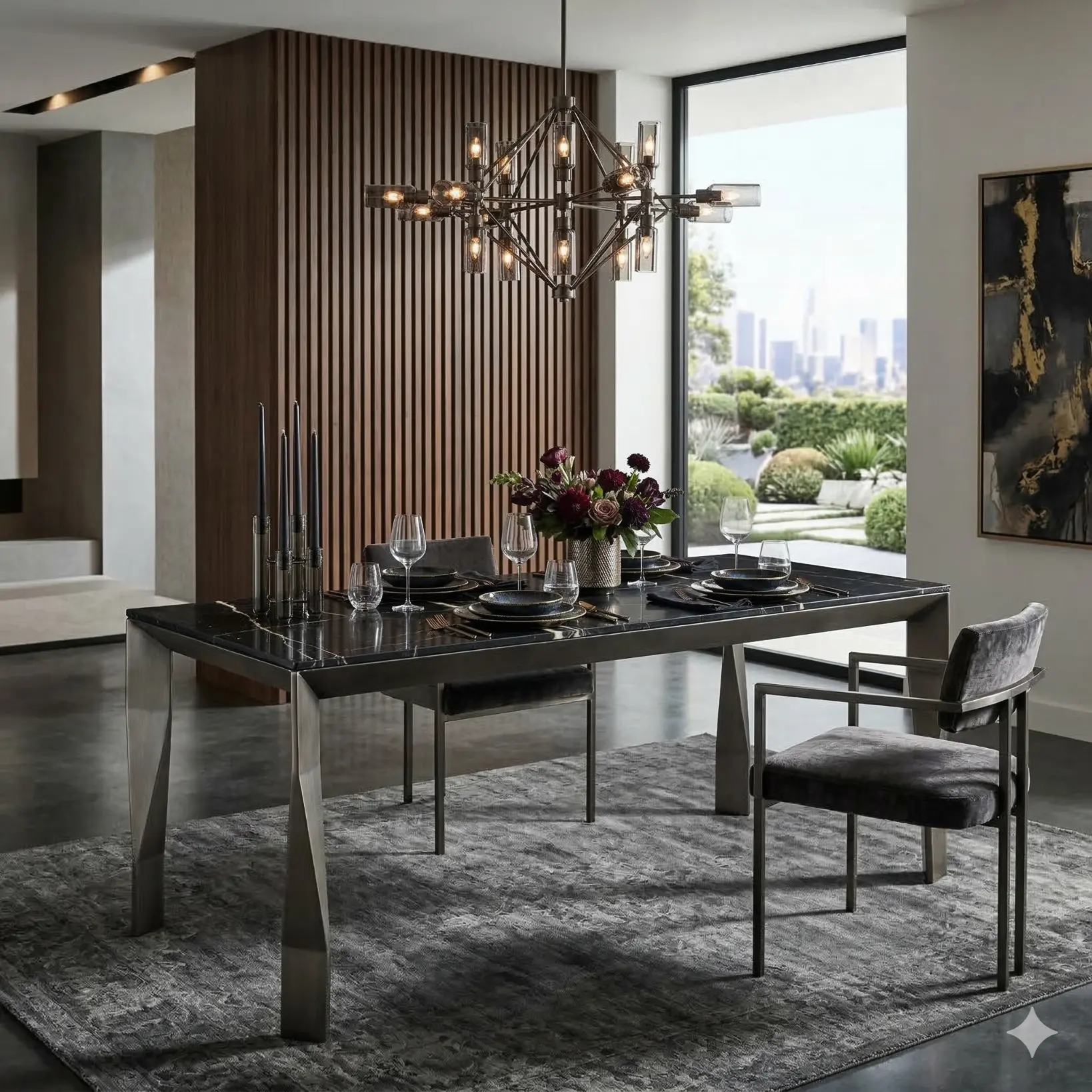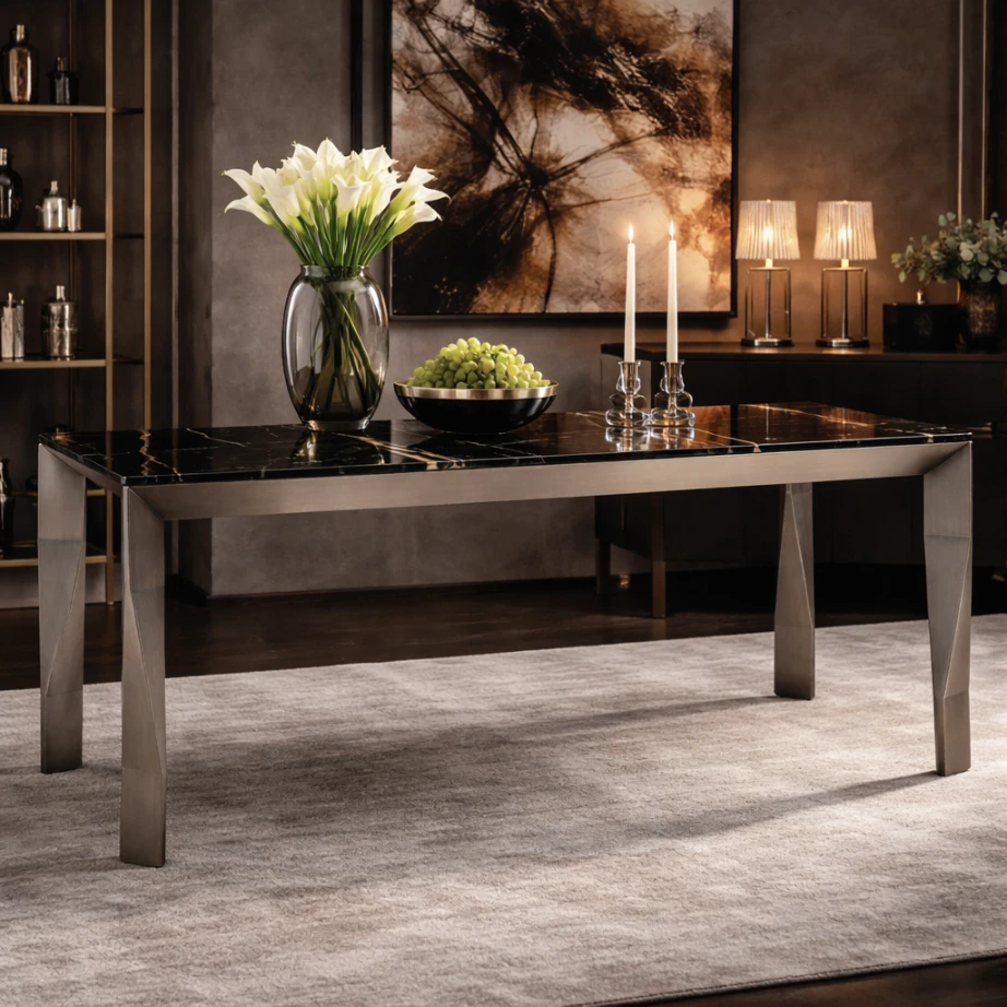 This Pantelleria Dining Table is composed as a single, disciplined line: a slim stone plane held within a folded metal frame. The top reads as calm and precise, with a dark surface and restrained veining that adds depth without ornament. The structure is where the character sits—metal edges wrap down into the legs, resolved as faceted planes that catch light in quiet shifts and keep the piece visually sharp. Proportions are intentionally slender, with generous clearance beneath, allowing it to work as an entry console, a gallery-like display surface, or a refined counterpart behind seating.