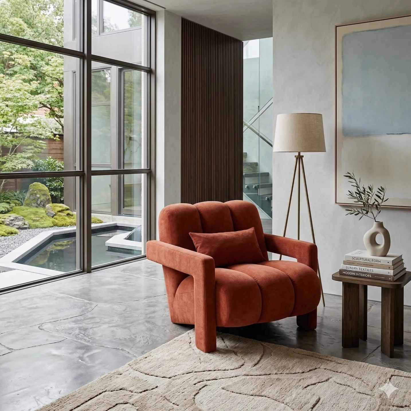 This Pisaea Armchair balances softness with structure. A broad, channelled seat creates a composed sense of volume—rounded, inviting, and visually disciplined through its repeated vertical cadence. The back rises in three softly sculpted sections, holding a loose cushion that refines the posture without interrupting the form. What gives the piece its architectural clarity is the arm frame: a clean, rectilinear wrap that reads almost as an external brace, sharpening the silhouette and anchoring the softness within. The overall proportion is low and grounded, with a quiet graphic presence that remains calm in the room.