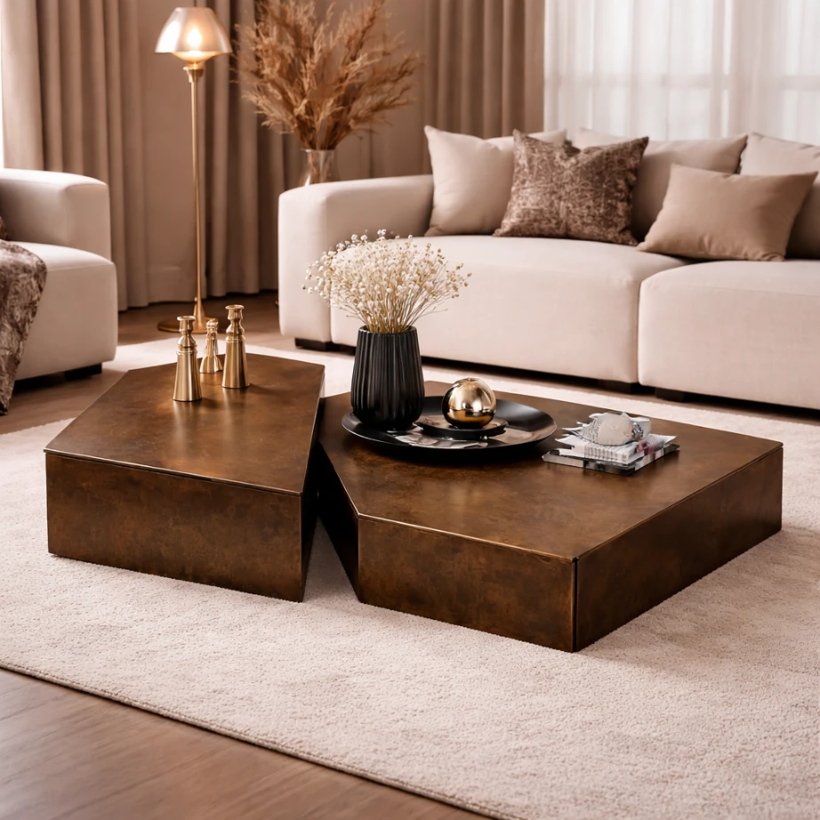 This Ragusa Coffee Table is defined by mass and geometry. Two low volumes sit close to the floor, their polygonal tops cut with clear angles that feel architectural rather than decorative. The pieces relate through proportion and orientation: aligned, they read as a single expanded surface; offset, they create a layered composition with calm negative space between. The metal finish deepens the form—matte and bronzed—so light moves gently across the planes without glare. In a seating area, the set anchors the room with understated presence, relying on balance and material clarity rather than detail.