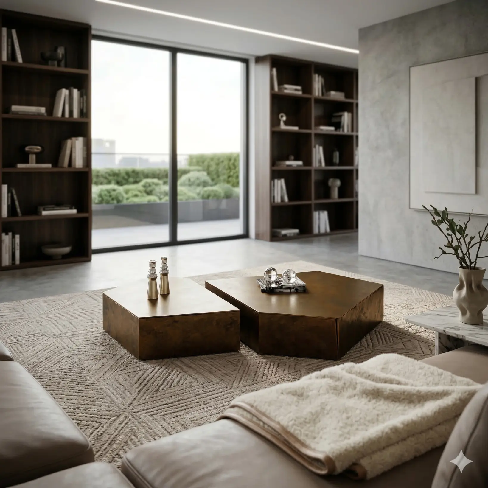 This Ragusa Coffee Table is defined by mass and geometry. Two low volumes sit close to the floor, their polygonal tops cut with clear angles that feel architectural rather than decorative. The pieces relate through proportion and orientation: aligned, they read as a single expanded surface; offset, they create a layered composition with calm negative space between. The metal finish deepens the form—matte and bronzed—so light moves gently across the planes without glare. In a seating area, the set anchors the room with understated presence, relying on balance and material clarity rather than detail.