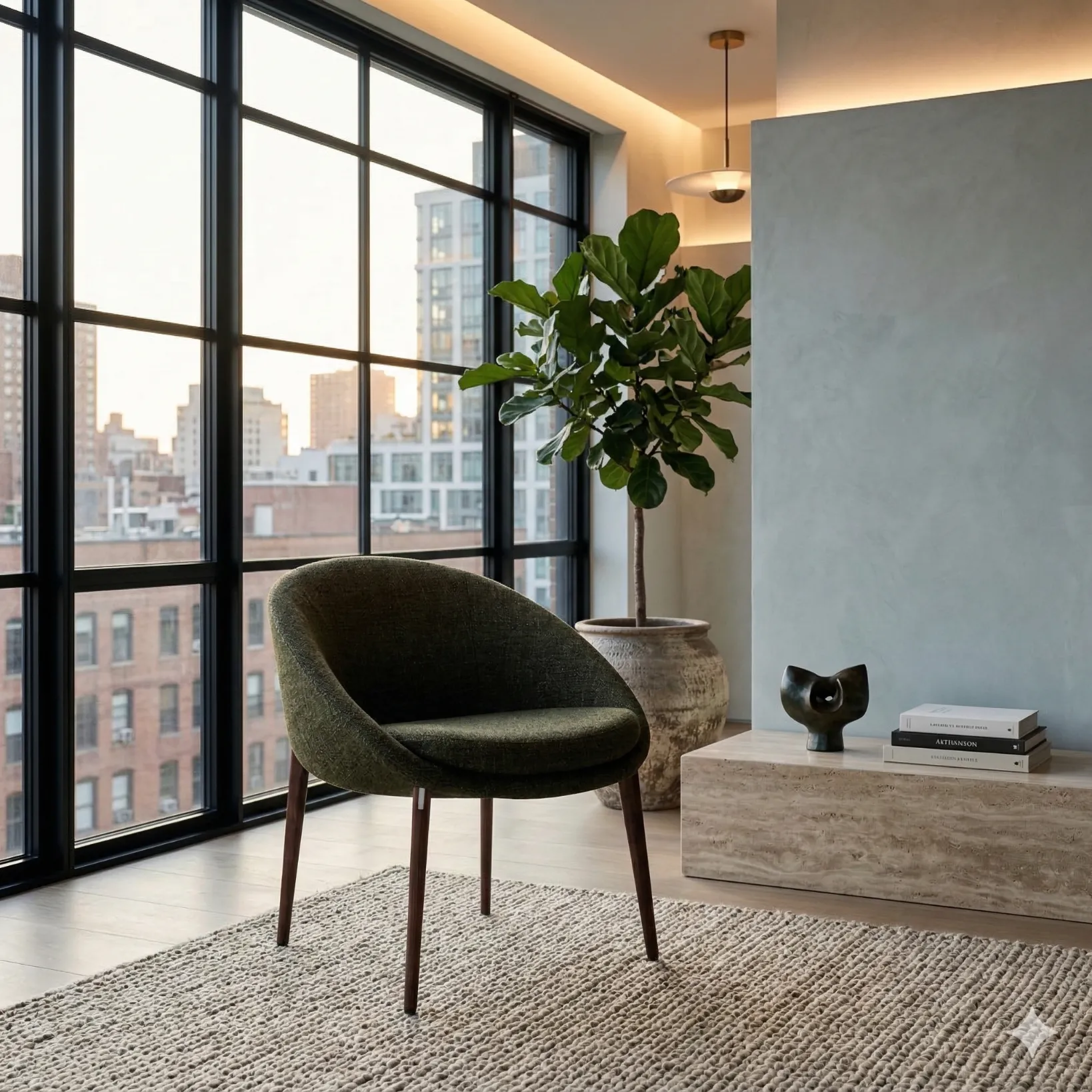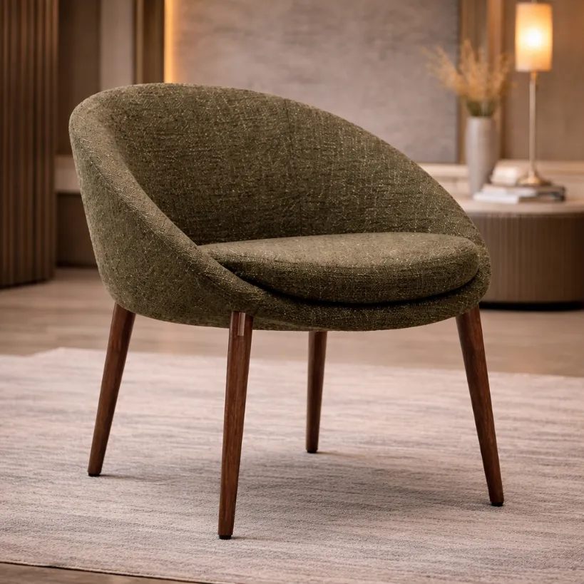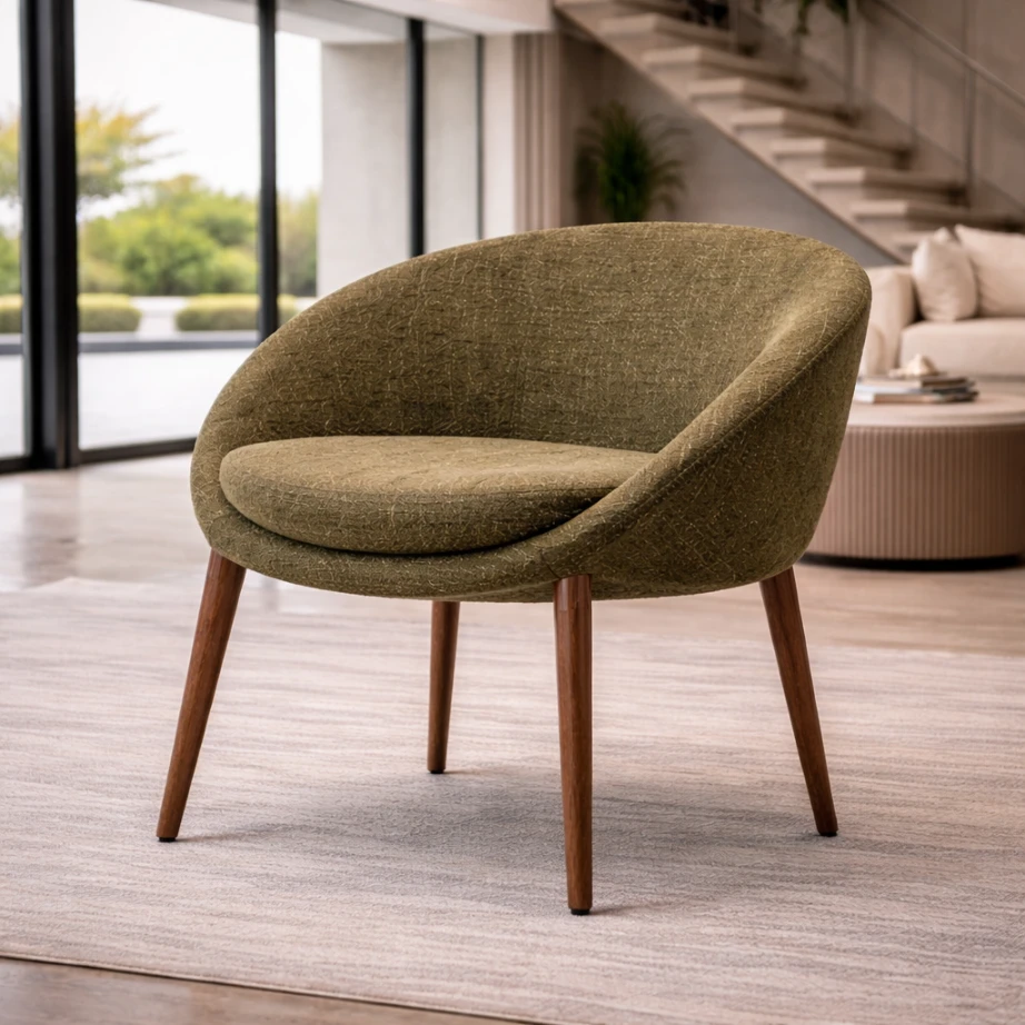 This Rosa Dining Chair is defined by a single continuous curve: a softly wrapped back that gathers at the sides, forming a quiet cradle around the sitter. The volume is compact and disciplined—rounded, but not heavy—held on slender legs that keep the stance light. A tailored seat cushion sits neatly within the shell, maintaining a clean edge line and a composed relationship between structure and softness. Subtle seams follow the curvature with restraint, allowing the chair’s proportion and the texture of the upholstery to carry the presence. It reads naturally at a dining table, but is equally suited to a desk or dressing area where comfort needs to remain refined.