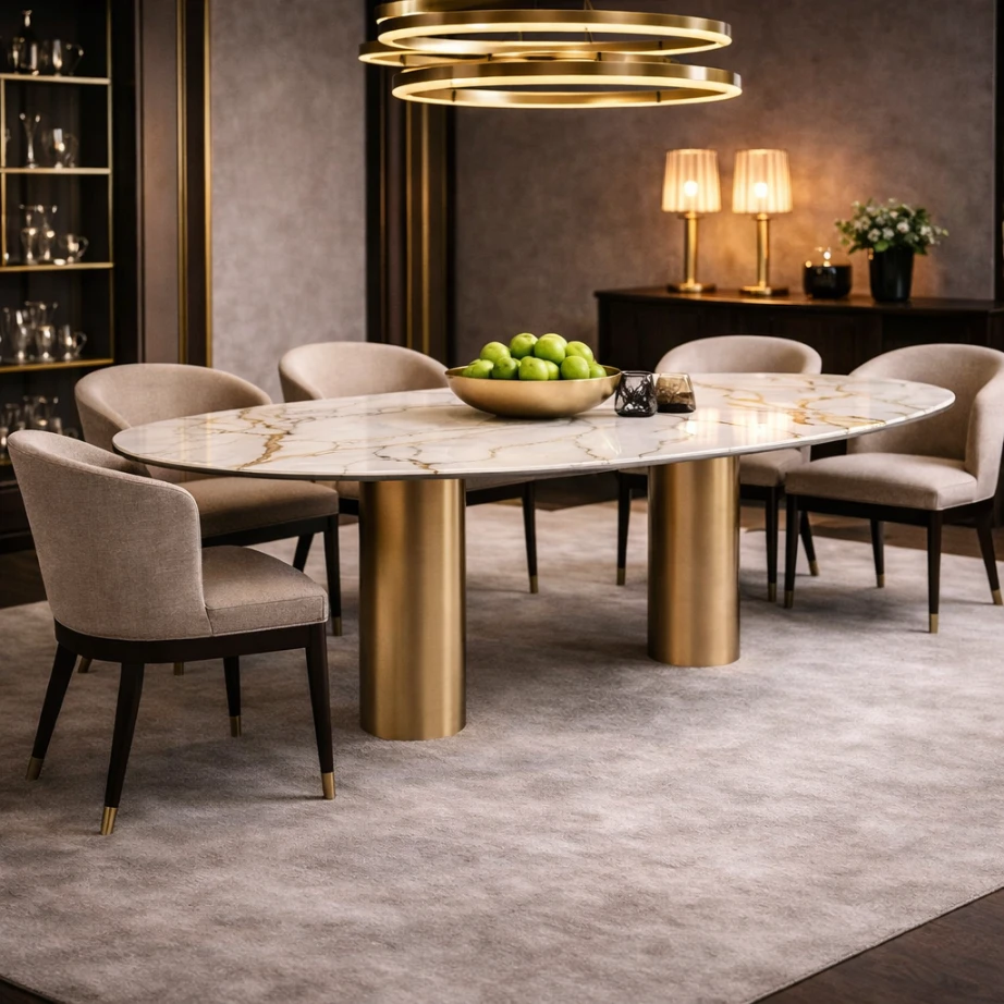 This Salina Coffee Table is defined by quiet geometry and material clarity. The top is an elongated oval—soft at the edge, disciplined in thickness—designed to sit lightly in the room while offering a generous surface. Beneath, three cylindrical legs create a calm architectural rhythm, their spacing giving the piece stability without visual density. The composition is intentionally simple: a continuous stone plane meeting warm metal supports, with proportion and balance doing the work. It suits both tonal interiors and more layered settings, where tactile contrast can remain understated.
