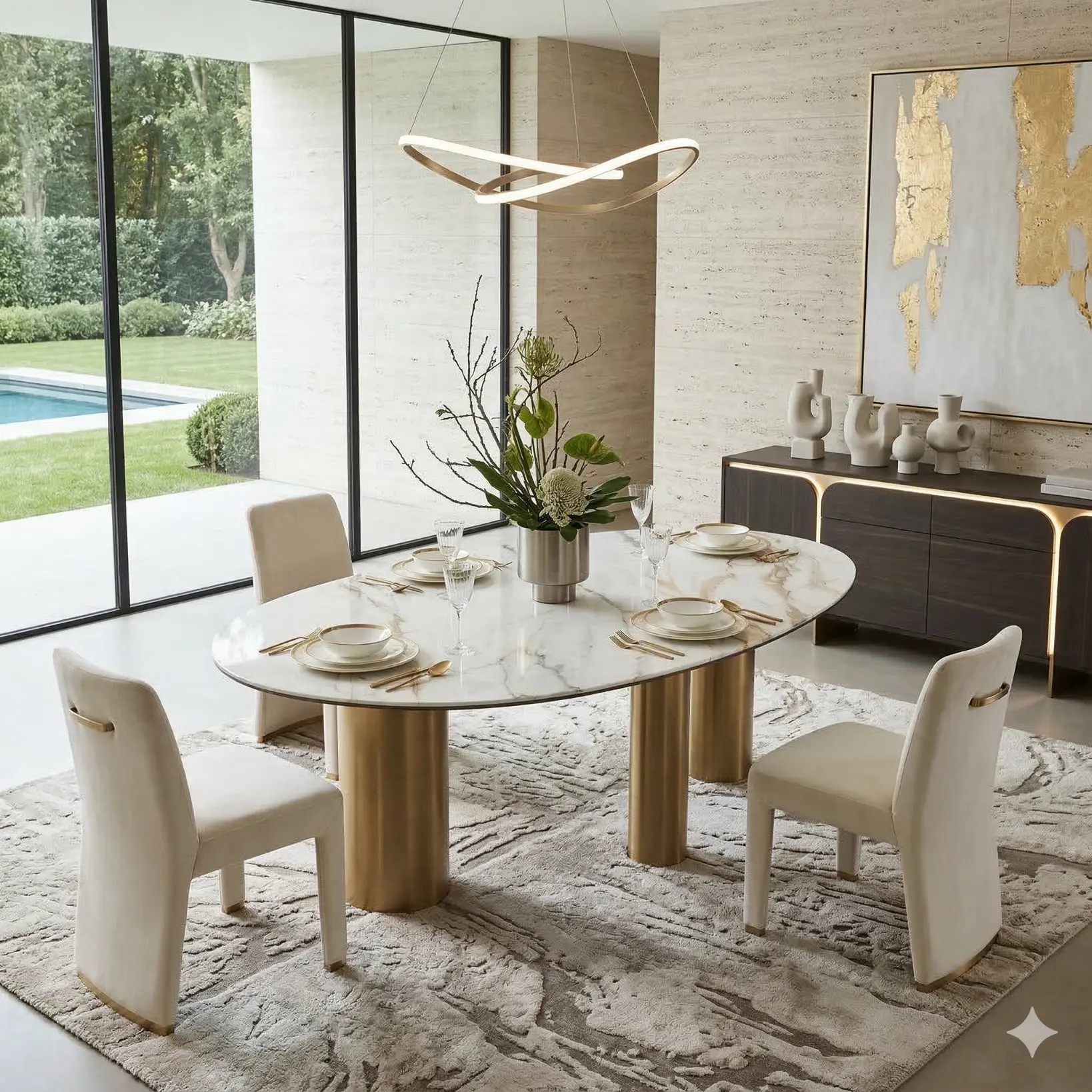 Available in a curated range of marble and stone options, with metal leg finishes offered in alternative tones to adjust warmth and contrast. Customization can include top size and thickness variations, as well as honed versus lightly polished finishes, while preserving the table’s balanced proportions and understated presence.