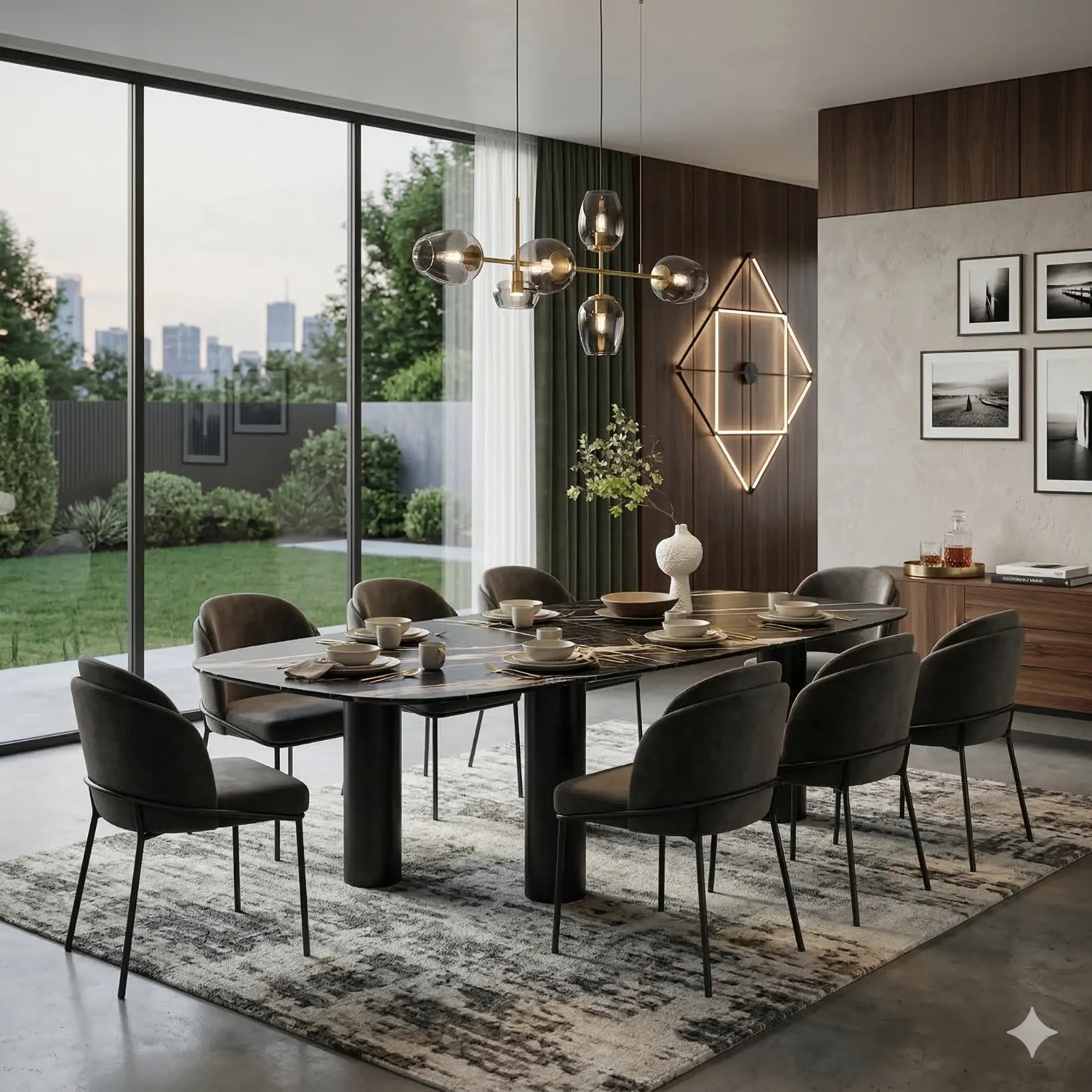 This Segesta Dining Table is defined by a quiet sense of scale. The top reads as a long, continuous stone plane—softened at the corners and kept visually thin—allowing the veining to register as a restrained graphic line rather than decoration. Beneath, a sequence of cylindrical legs repeats at measured intervals, creating rhythm and stability while keeping the under-table volume open. The effect is monolithic but not heavy: a disciplined horizontal gesture supported by a calm vertical cadence. It suits rooms where proportion and materiality are the primary language, and where the table should anchor the space without excess detail.