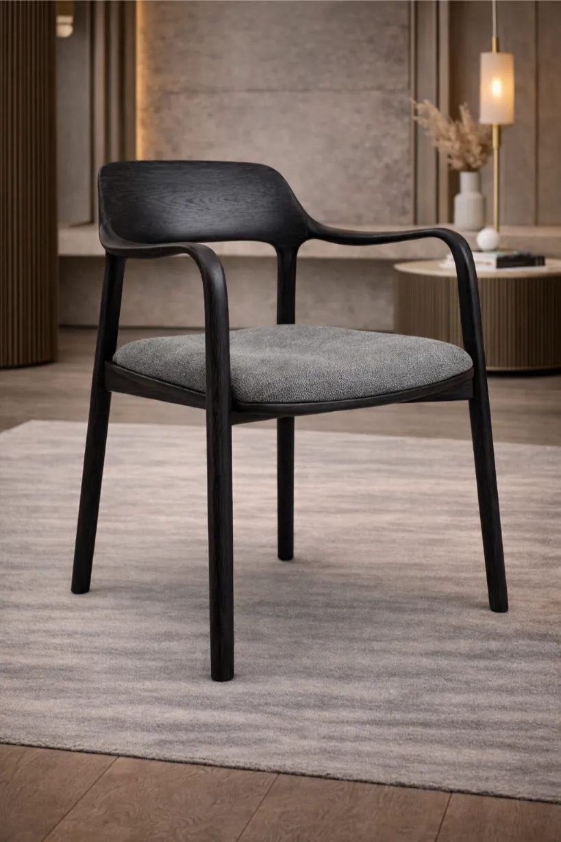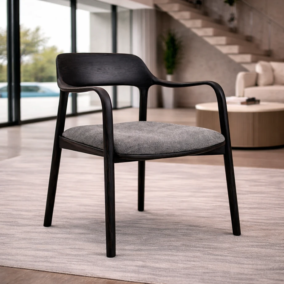 This Serena Dining Chair is a study in line and proportion. The backrest extends seamlessly into the arms, forming a single, continuous gesture that frames the sitter without enclosure. The silhouette is compact and graphic—slim through the legs, broader at the back—creating a quiet sense of balance. A tailored seat cushion sits neatly within the timber frame, introducing softness and texture against the wood’s smooth, matte presence. From every angle, the chair reads composed and disciplined: curved where it needs to be, clean where it matters, with the structure doing the work.