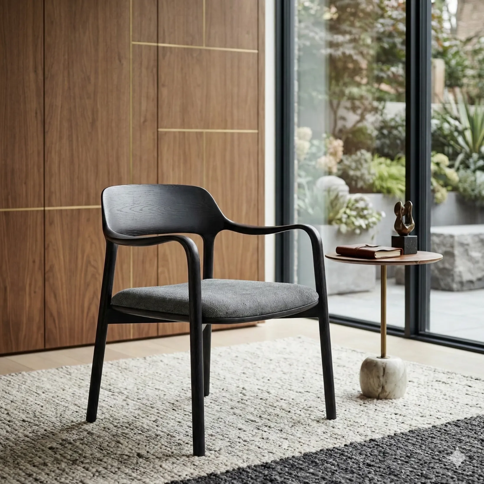 Crafted in solid wood—shown in a dark oak or walnut stain—with carefully shaped transitions and softened edges that preserve the purity of the frame’s continuous line. The seat cushion is upholstered in a tightly woven textile, likely a wool or linen blend, tailored with clean perimeter stitching to sit flush within the seat rail. Joinery and sanding are resolved to keep the arms and backrest visually continuous, reinforcing the chair’s architectural clarity.