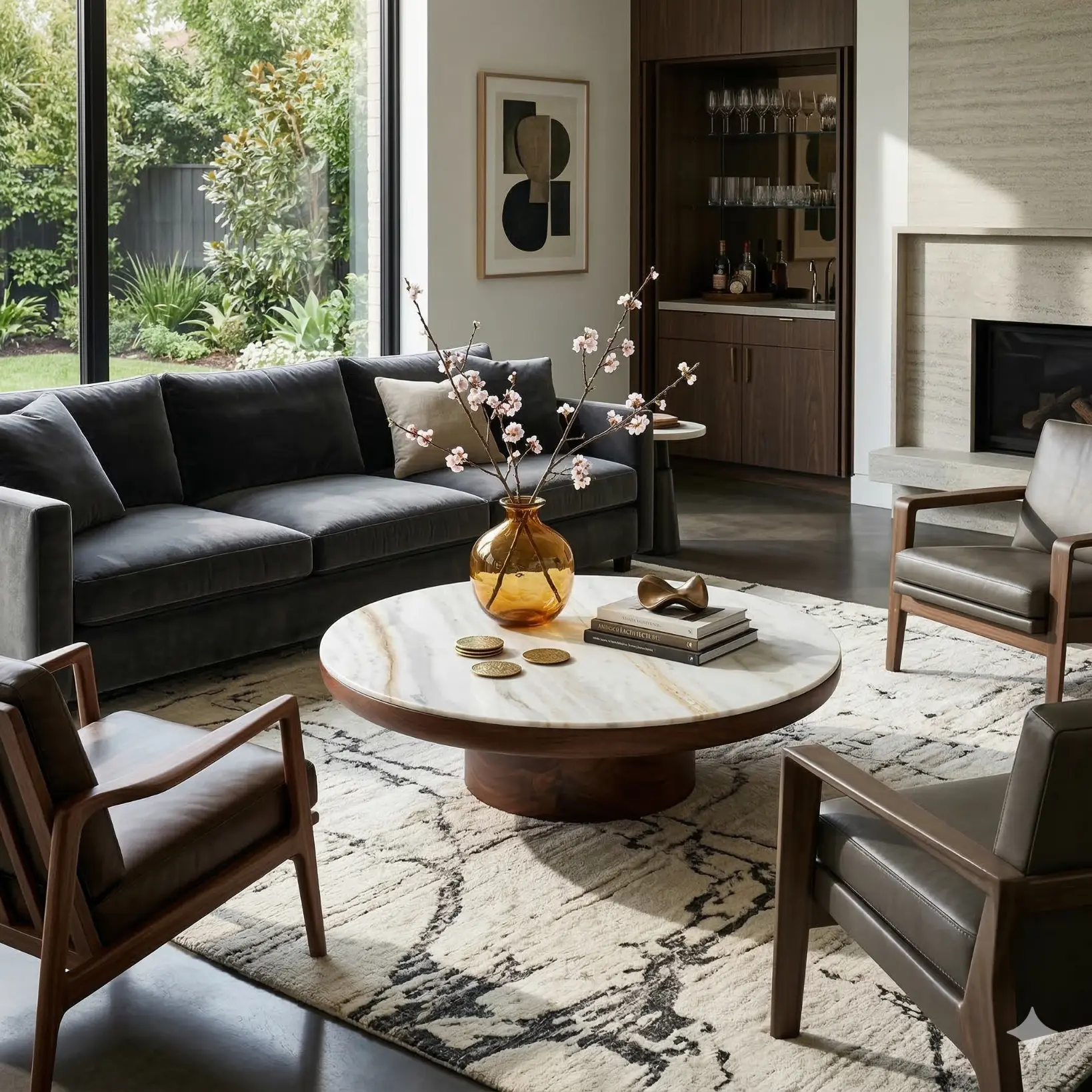 This Stromboli Coffee Table is defined by disciplined balance: a pale stone disc held on a warm timber core. The top reads light at the edge—clean, softly rounded—allowing the veining to register as a restrained graphic movement across the surface. Beneath, a cylindrical wood base concentrates the mass at the center, creating a grounded stance while keeping the perimeter open and calm. The composition is simple but precise, relying on proportion and material clarity rather than detail. In a room, it feels quiet and stable—stone and wood held in deliberate, architectural tension.