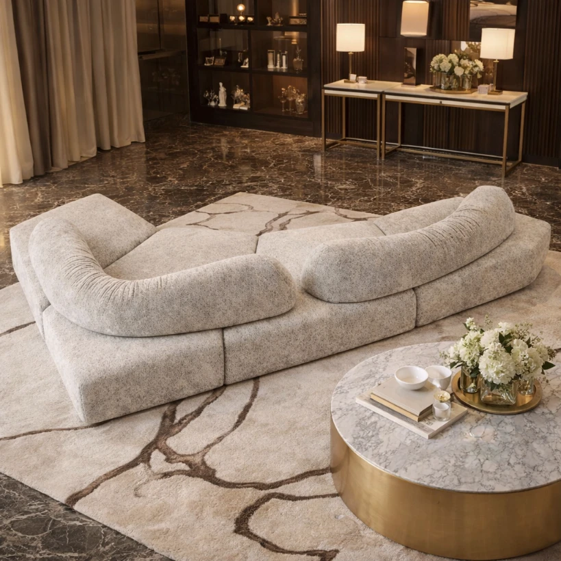Modules can be specified individually for bespoke configurations, with customization across upholstery tones, tactile finishes, and backrest placement. The result is a system defined by architectural balance, tactile contrast, and a composed, lounge-forward presence.