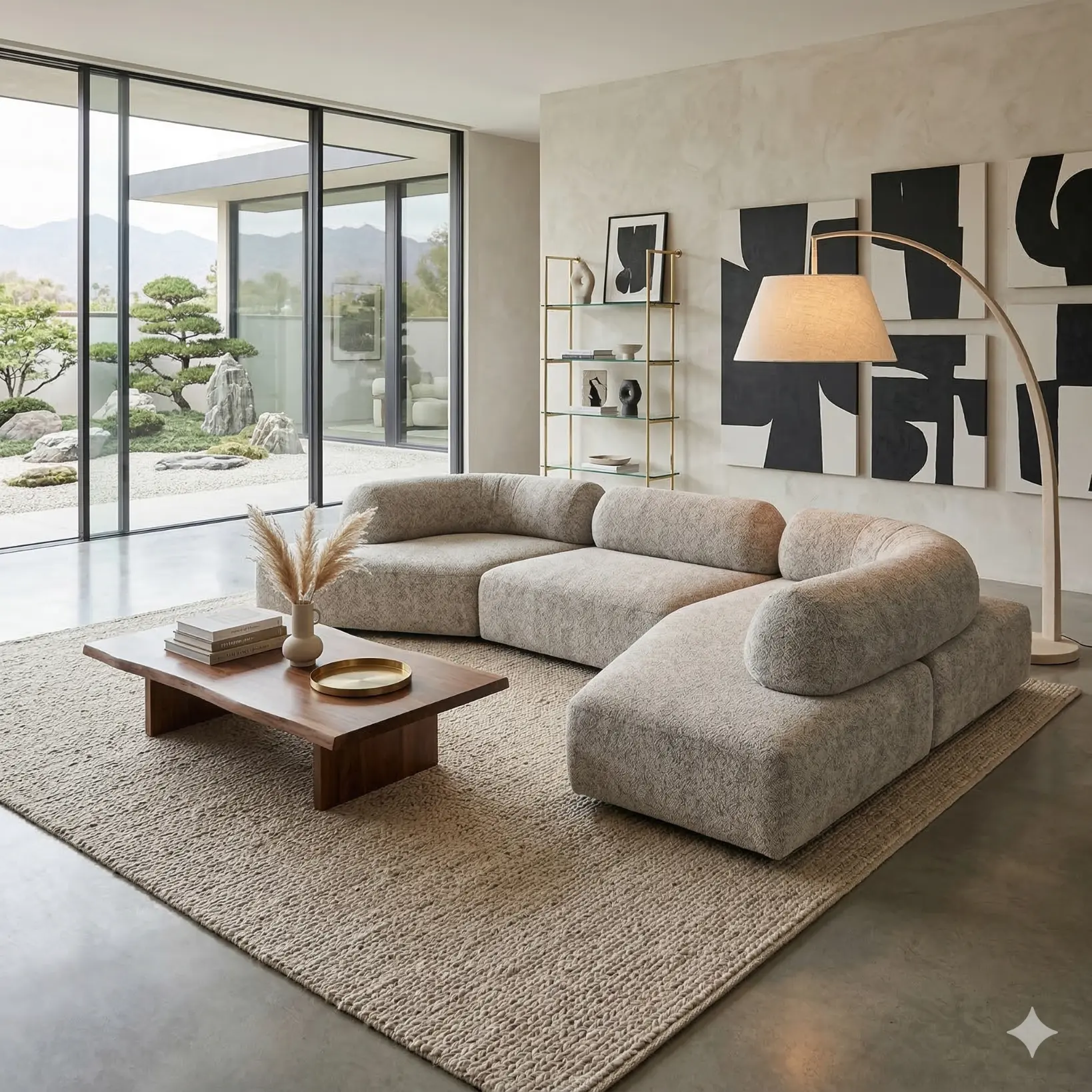 This Garofano modular sofa is conceived as a relaxed landscape of forms. The seat modules sit low to the ground, creating an extended horizontal plane that feels calm and grounded. Rounded backrests rest along the perimeter, introducing softness and subtle structure without interrupting the flow.