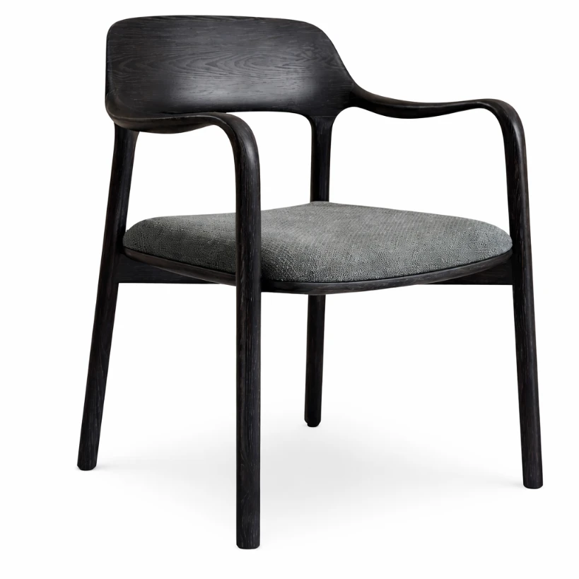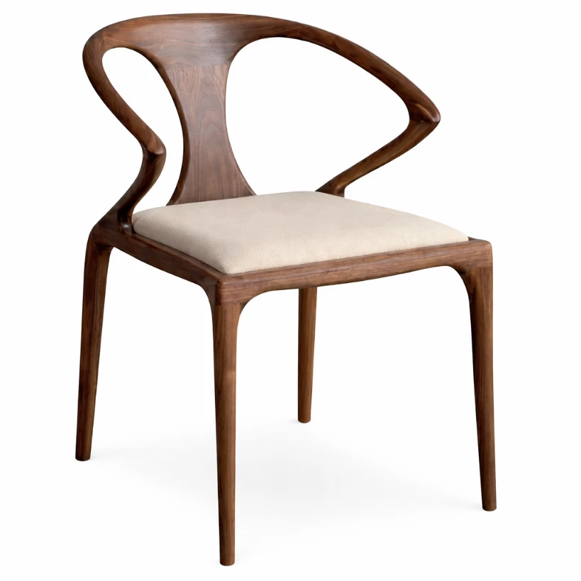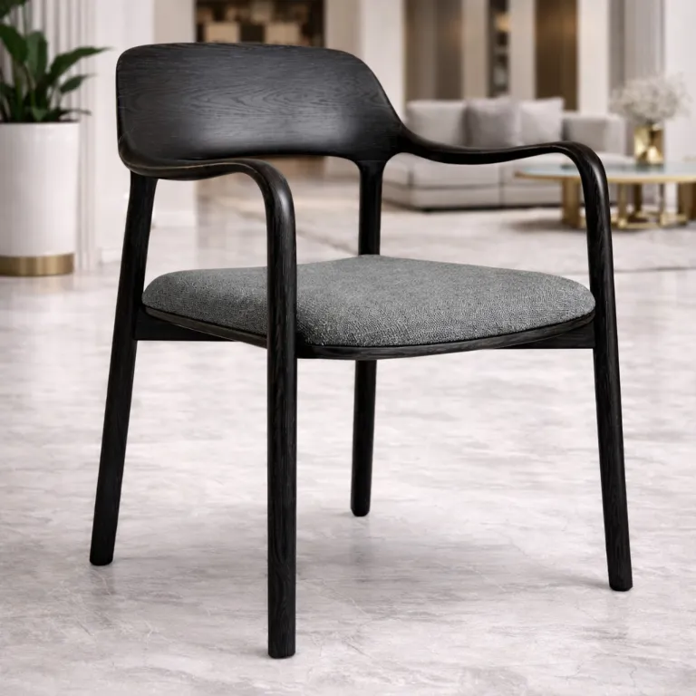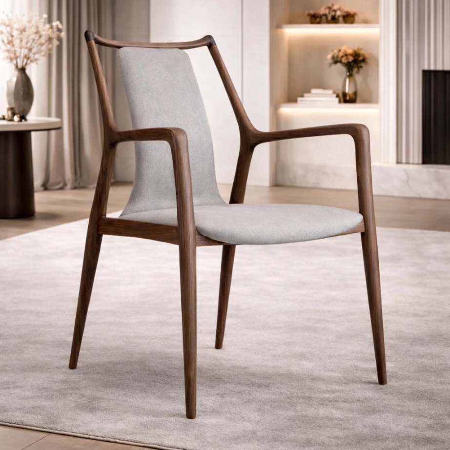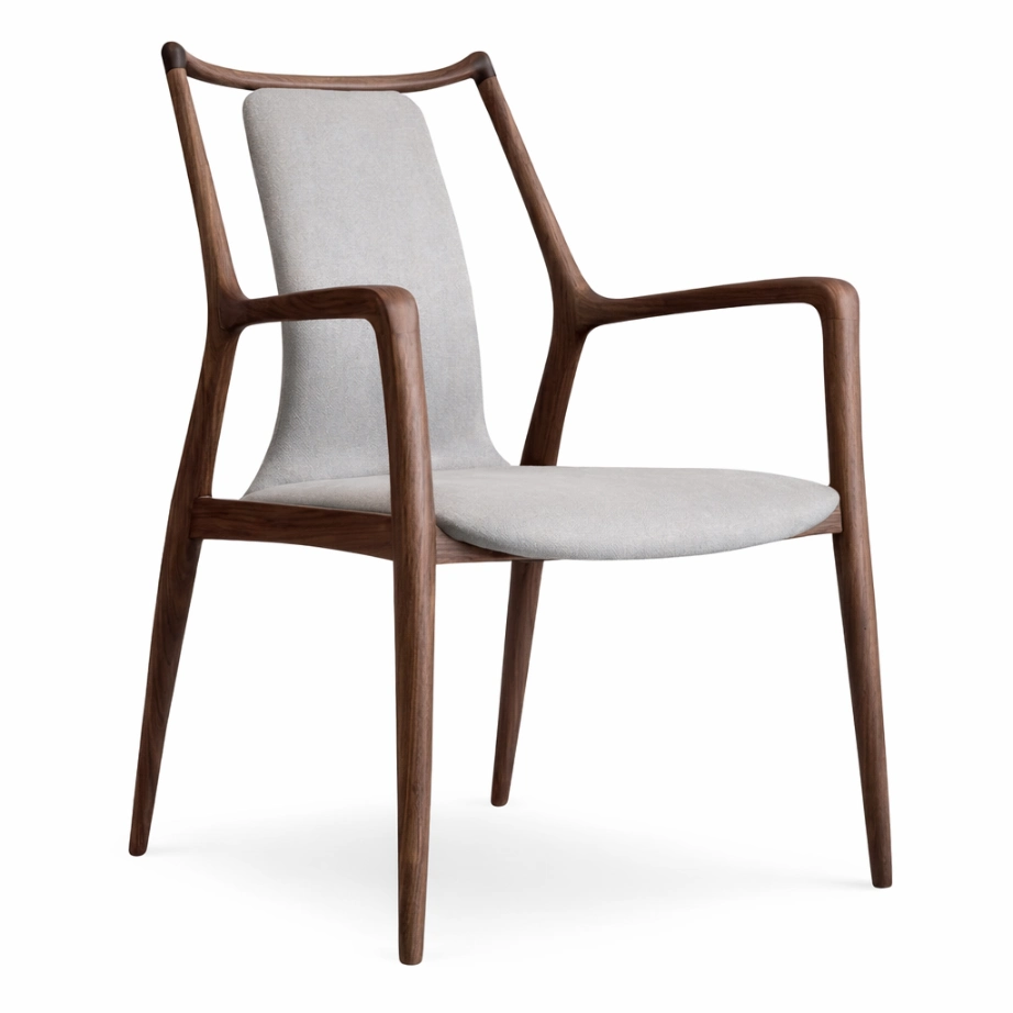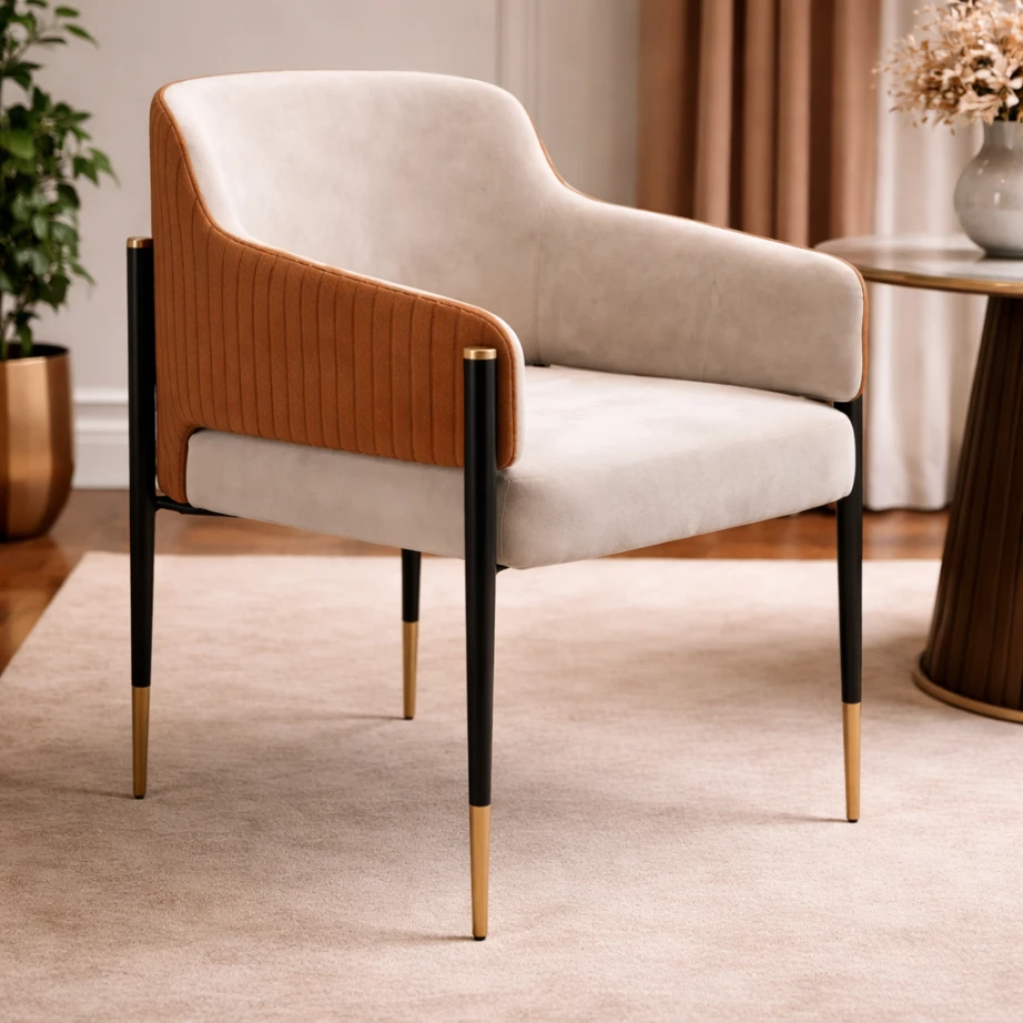 This Viola Dining / Accent Chair is composed through clear planes and discreet detailing. The seat and back read as soft, continuous surfaces—supportive, calm, and disciplined in proportion—while the arm line wraps around in a gentle sweep to create subtle enclosure. On the exterior, a warm leather side panel introduces a controlled graphic note: vertical channels add rhythm without interrupting the chair’s restraint. The structure is lifted on slender legs, giving the piece a light architectural stance and allowing the upholstery volumes to appear composed rather than heavy. It suits refined living spaces and desk settings where material balance and clean geometry matter.